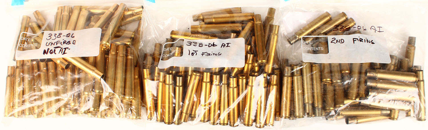 Large lot of 338-06 AI unfired empties, N.P.E. and fired empties. Grade: Excellent - Value: 2 to 200