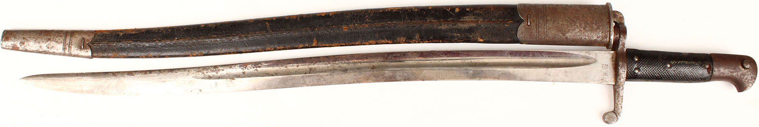 RARE! British, P1860 Martini Henry Bayonet, Left side of blade is marked, crown over ''V.R'', spine of blade is marked, crown over ''E'' over ''27'', right side of blade is marked, ''WD'', crown over ''F'' over ''27'', top of guard is marked, ''WD'', blade has some rust & patina, comes with leather & metal sheath. This bayonet was originally a Pattern 1856 bayonet but was converted to fit the new martini henry rifles because of a lack of a new approved sword type bayonet. Grade: Very Good + - Value: 150 to 300
