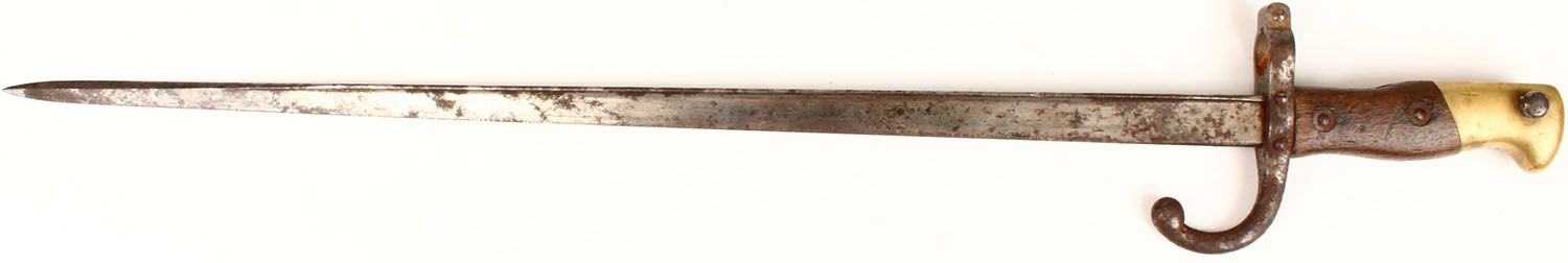 French, M1874 Gras bayonet, Spine of blade is marked in French & translates to, ''MANUFACTURED AT THE ARMORY AT ST. ETIENNE APRIL 1879'', right side of blade marked with two faint stampings, left side of guard is marked with two faint stamping, & ''87?77, right side of guard has one faint stamping, top of guard has various stampings, blade has rust & patina. Grade: Very Good - Value: 40 to 120