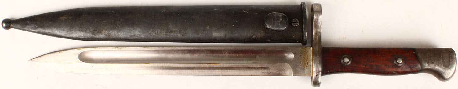 Chile, M1895 Bayonet, left side of blade is marked, ''WEYERSBERG'', ''KIRSCHBAUM & C'', ''SOLINGEN'', right side of bladed is marked with Chile crest & three interlapping circles, right side of guard is marked ''G 6086'', Blade has some original grease still remaining, comes with metal sheath. Grade: Excellent - Value: 30 to 90