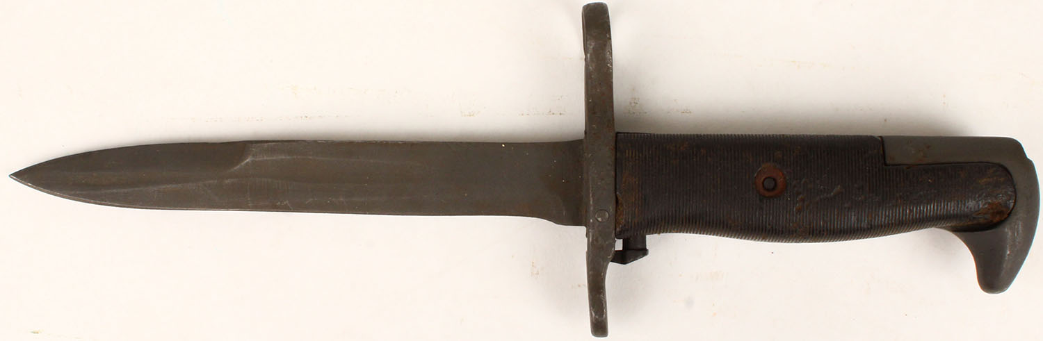US, M1 bayonet, South Korean Modified, blade has no markings, blade has some wear & light rust marks, This bayonet was a original M1 bayonet that was modified by the south Korean forces to the M1 carbine bayonet profile which was preferred by the South Korean forces. Grade: Very Good ++ - Value: 30 to 90