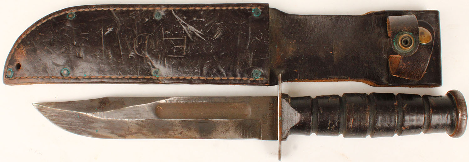 US Navy, M2 fighting knife, left side of blade is marked, ''U.S.'', ''CAMILLUS N.Y.'', blade has wear, comes with leather sheath. Grade: Very Good + - Value: 20 to 60