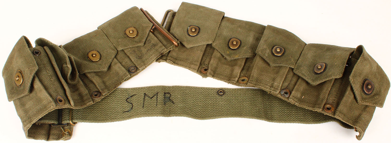 US, M1923 Cartridge belt, info on belt has worn away and is un-readable, ''SMR'' Written on inside of belt, brass has corrosion & belt has stains. Grade: Very Good - Value: 20 to 60