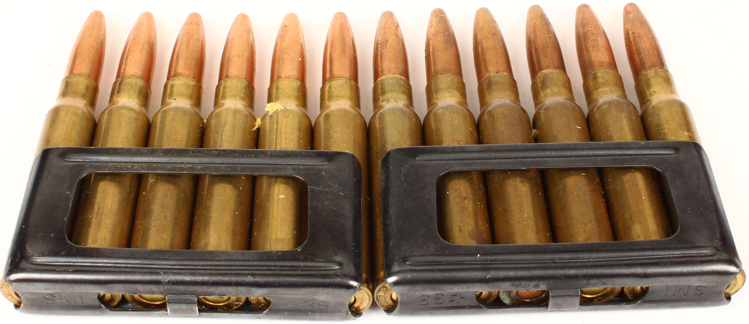 Lot of two loaded, Italian, 7.35 carcano En-bloc clips, H/S ''SMI'', ''939''. Grade: Very Good - Value: 10 to 20
