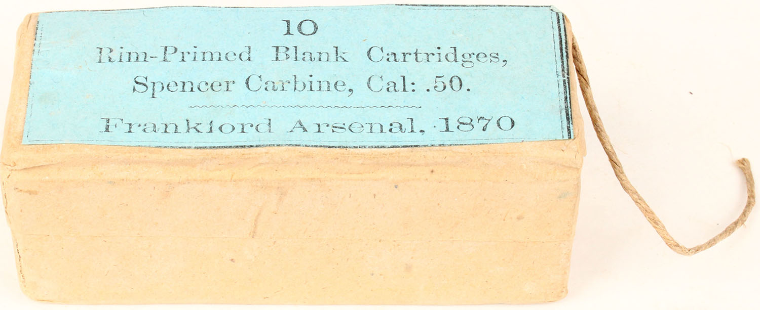 Frankford Arsenal, .50 Spencer carbine Blanks, 1pc, FULL & SEALED, buff box with blue label & black print, box is solid with rub wear. Grade: Excellent + - Value: 20 to 60