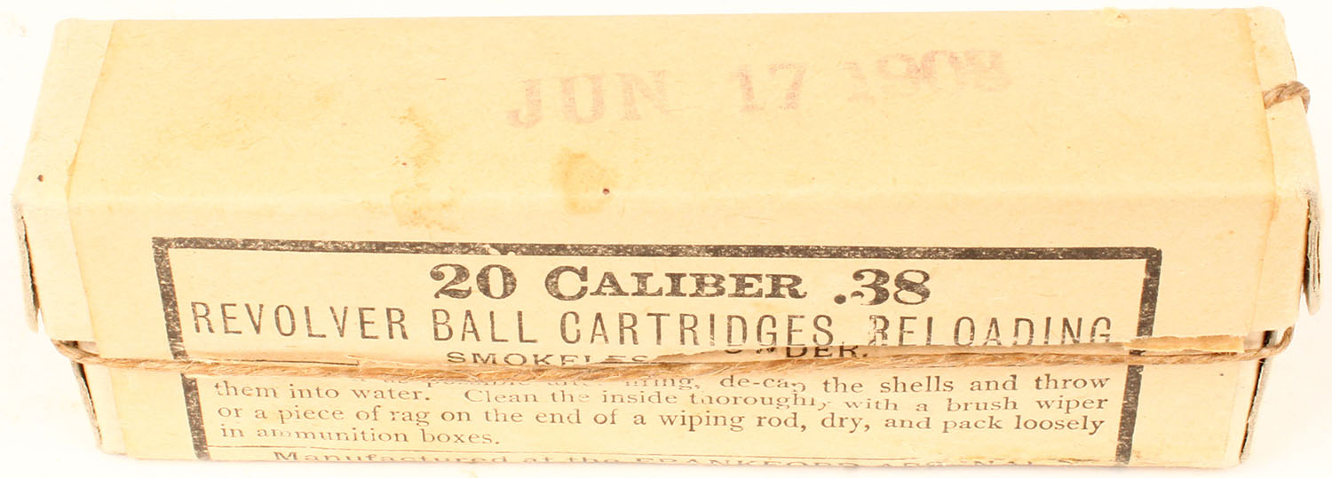 Frankford Arsenal, .38 Revolver Ball Cartridges, Reloading, smokeless powder, top of box is stamped ''JUN 17 1908'', 2pc, FULL & SEALED, buff box & label with black print, box is solid with light rub marks, & light edge wear. Grade: Excellent ++ - Value: 10 to 40