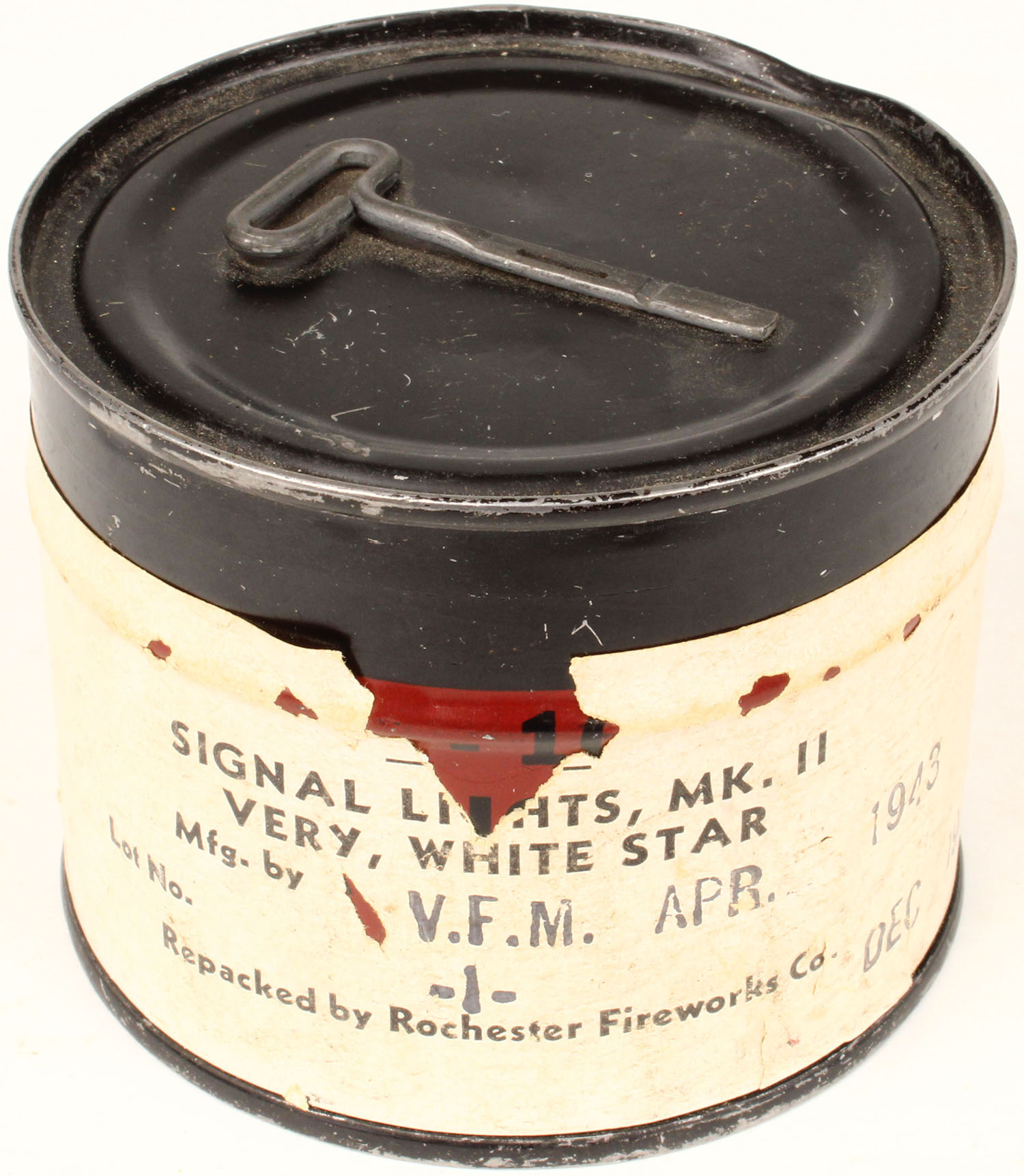 V.F.M./ Rochester Fireworks Co., Signal Lights Mk II, very white star, Lot 1, can, FULL & SEALED, black van with white label & black print, can/label is solid with small scratches, small ding on top of can, & age soiling, still has opening key on top, This can was made in 1943 by V.F.M. and then repacked by Rochester Fireworks Co. in 1945. Grade: Excellent - Value: 50 to 200