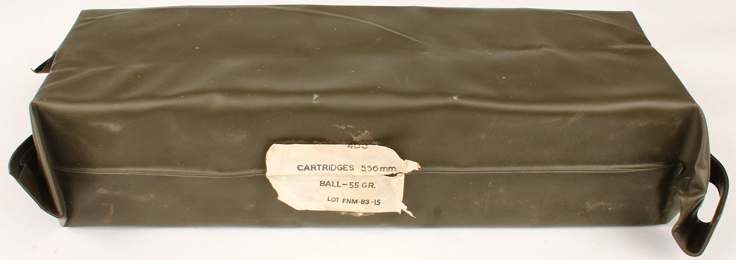 FNM (Portuguese), 5.56mm Ball, 55 Gr. Bullet, Lot FNM-83-15, pouch, FULL & SEALED 400 Rds., green pouch with white label & black print, pouch is solid with rub wear. Grade: Excellent - Value: 200 to 400