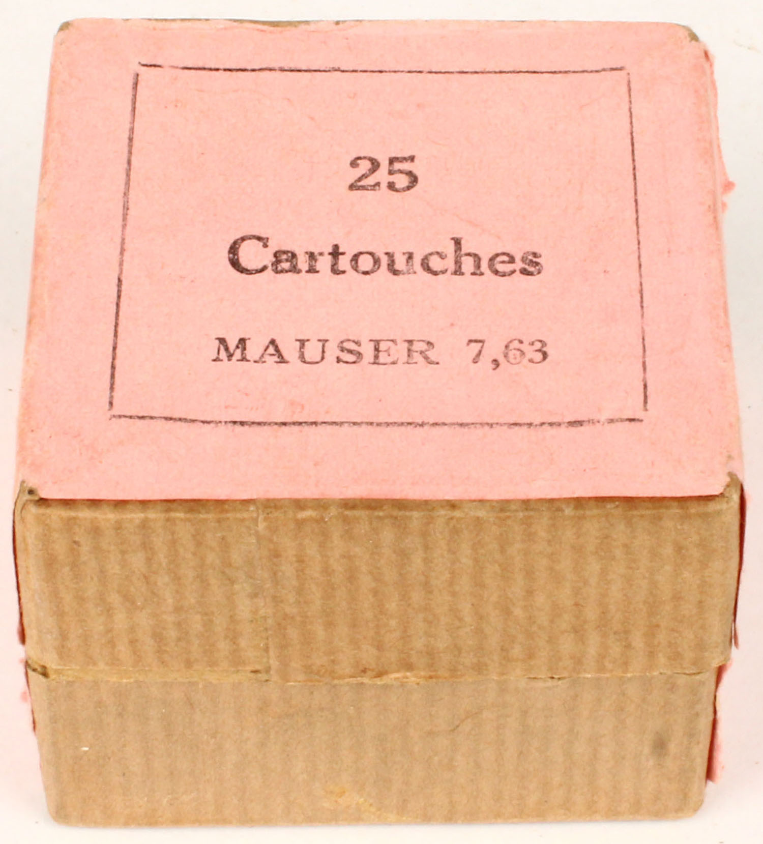 FN, 7.63mm Mauser, 2pc, Partial 22 correct Rds., buff box with pink label & black print, box is solid with minor rub marks & light handling wear, ammo is excellent. Grade: Excellent ++ - Value: 10 to 40