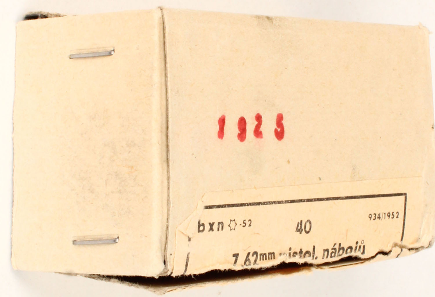 Czech, 7.62 Tokarev on clips, 1pc, Full, buff box with buff label & black print, box is solid with handling wear, two seam splits on left end, rub marks & edge wear, ammo is Very Good. Grade: Very Good + - Value: 10 to 30