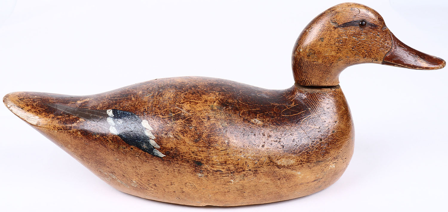 Mallard Hen, by Evans Decoy, glass eyes, solid wood, original paint, neck putty is missing, stamped on bottom. Grade: Excellent - Value: 100 to 1000