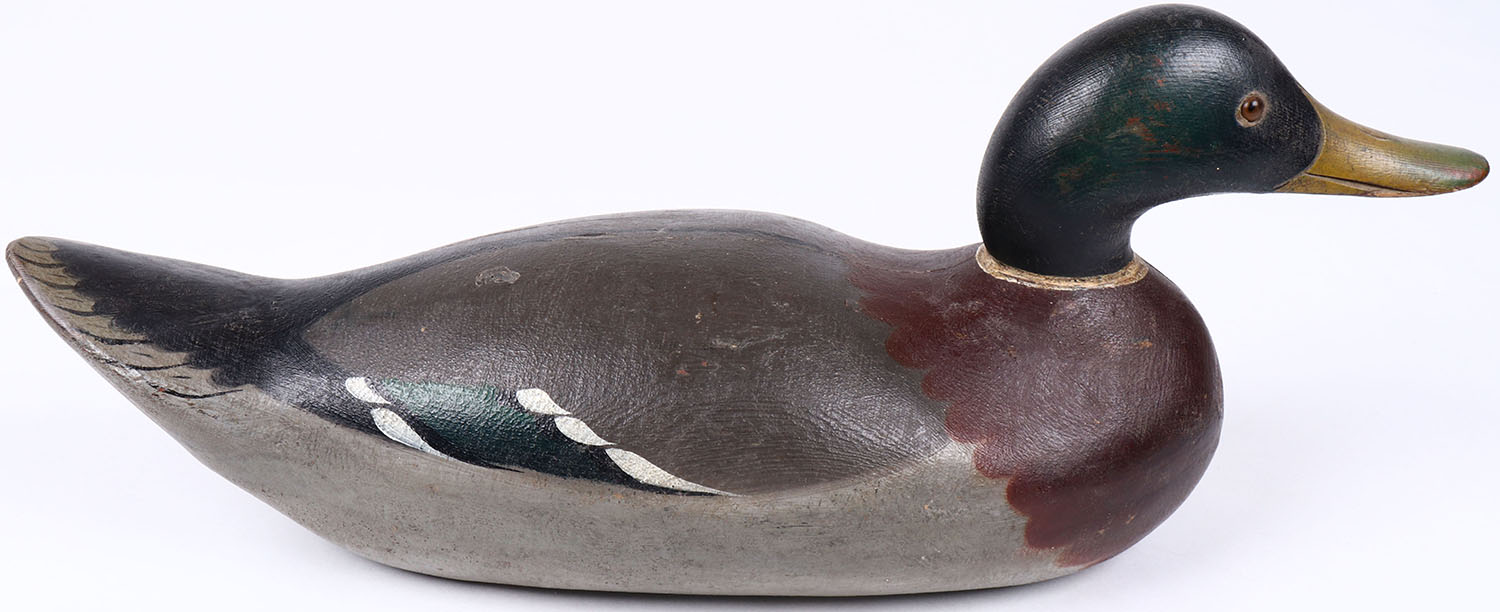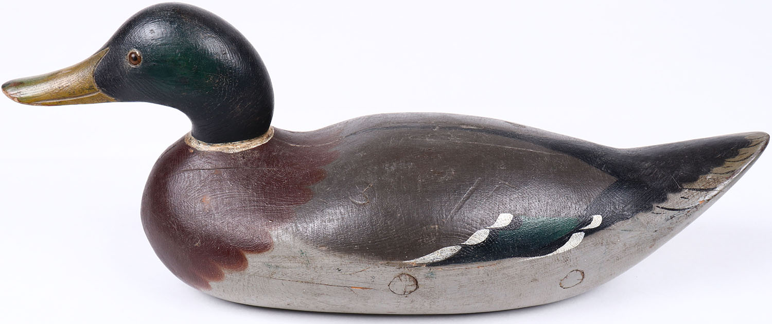 Mallard Drake by Mason Decoy Company, Detroit, MI,1896-1924 standard grade, glass eyes, solid wood, orignal paint, structurally excellent. Grade: Excellent - Value: 150 to 300