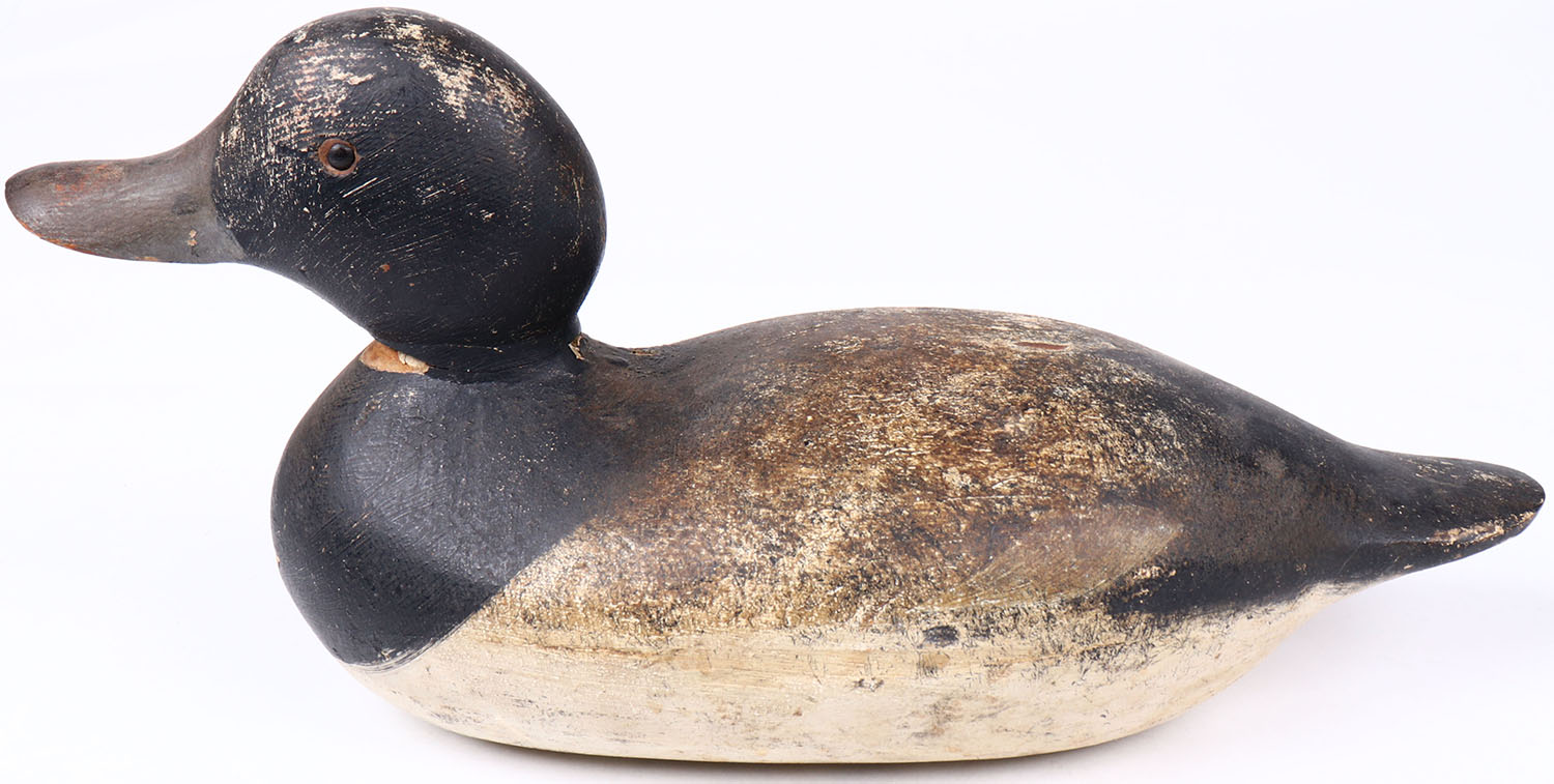 Bluebill Drake by Mason Decoy Company, Detroit, MI,1896-1924, standard grade, tack eyes, original paint with some touch up on bottom, structurally excellent. Grade: Excellent - Value: 50 to 150