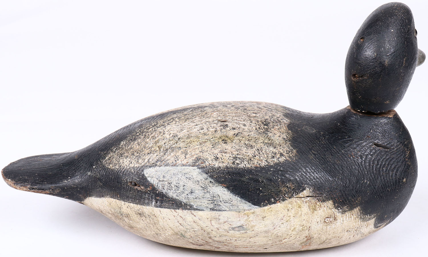 Bluebill Drake by Mason Decoy Company or Hays Decoy Company, standard grade, glass eyes, solid wood, original paint, has age cracks on bottom, head is loose. Grade: Excellent - Value: 50 to 150