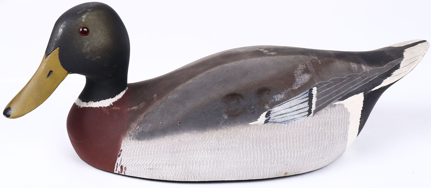 Mallard Drake by Ken Harris, Woodville, N.Y. glass eyes, solid wood, has age cracks on bottom, original paint with comb painting. Grade: Excellent + - Value: 50 to 100