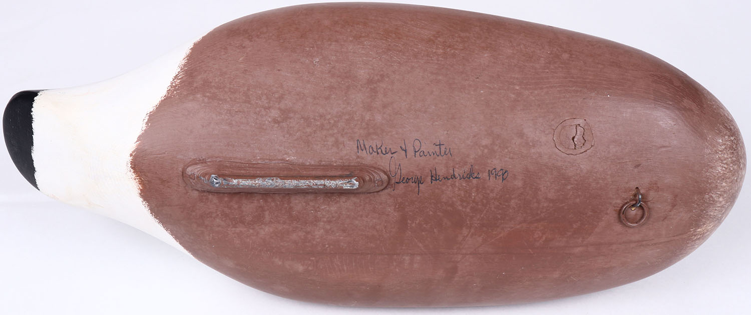 Canada Goose by George Hendricks, painted eyes, solid wood, original paint, signed on bottom, structurally excellent. Grade: MINT - Value: 100 to 200