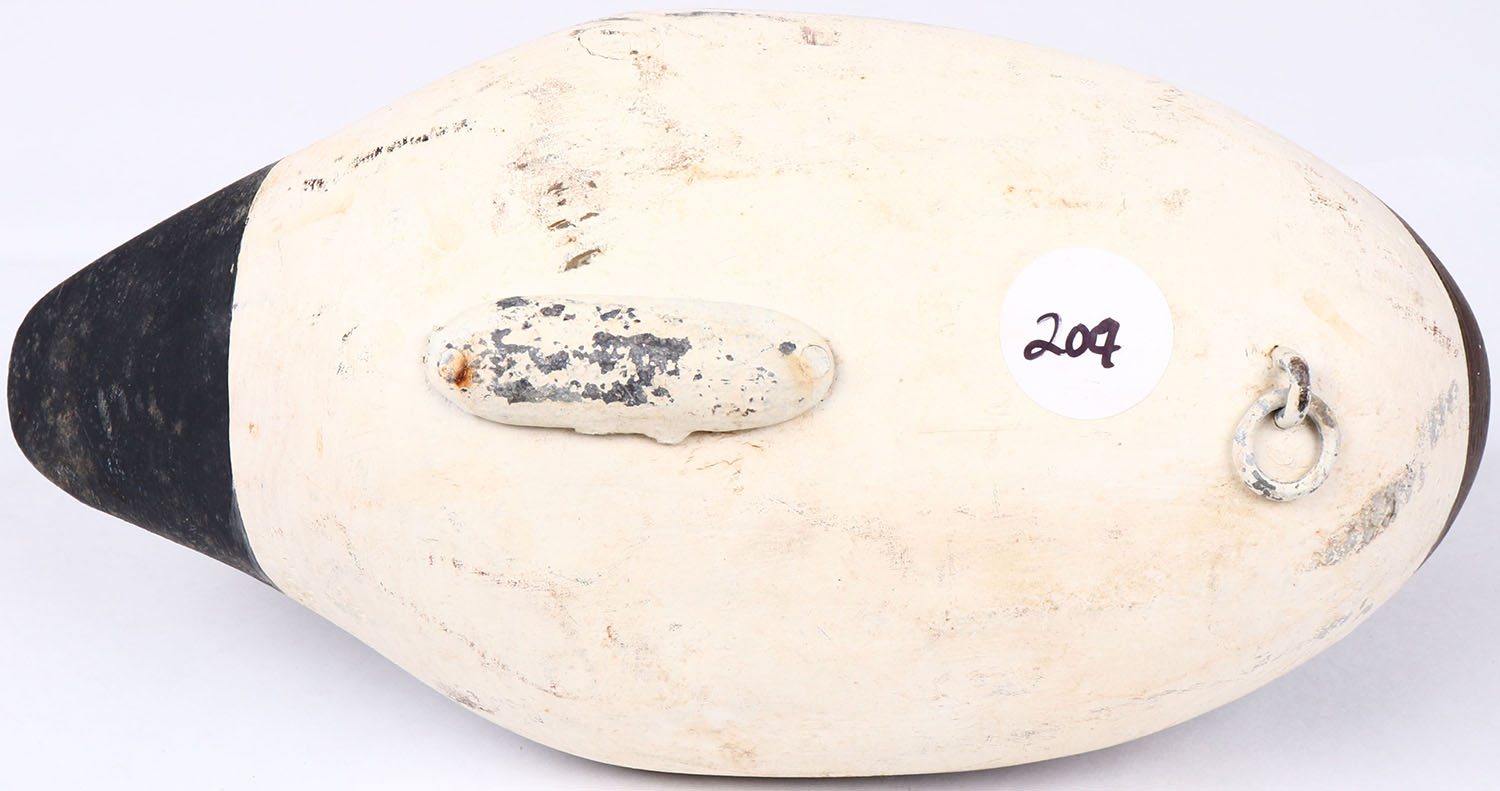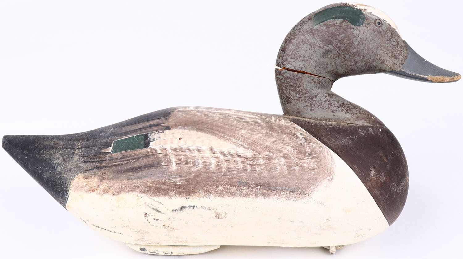 Widgeon Drake by unknown maker, painted eyes, solid wood, original paint, has hairline age crack around neck. Grade: Very Good ++ - Value: 40 to 80