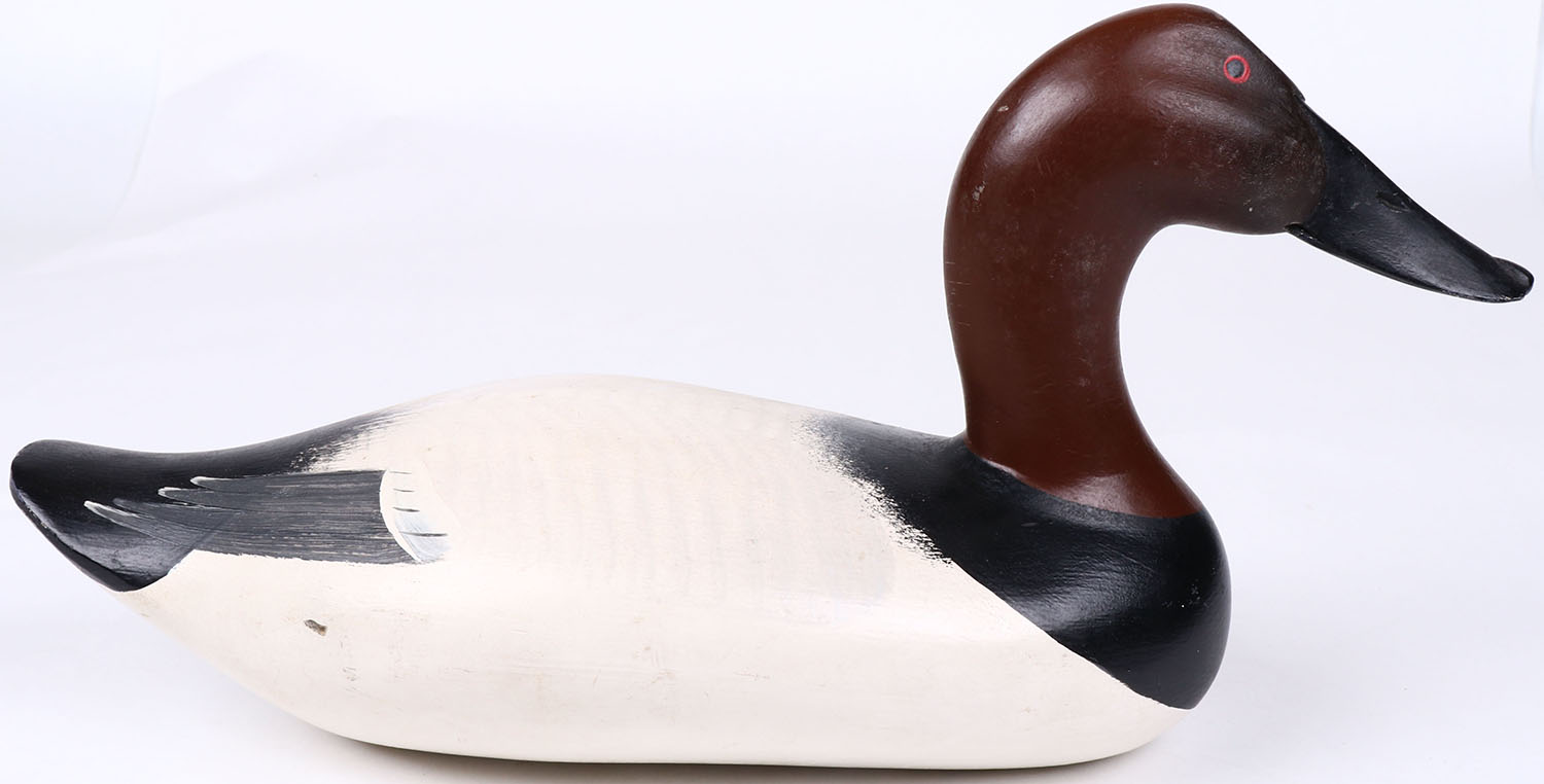 Canvasback Drake by John H Clark, (1985), Havre de Grace, MD, painted eyes, solid wood, structurally excellent, signed on bottom, original paint. Grade: Excellent - Value: 40 to 80