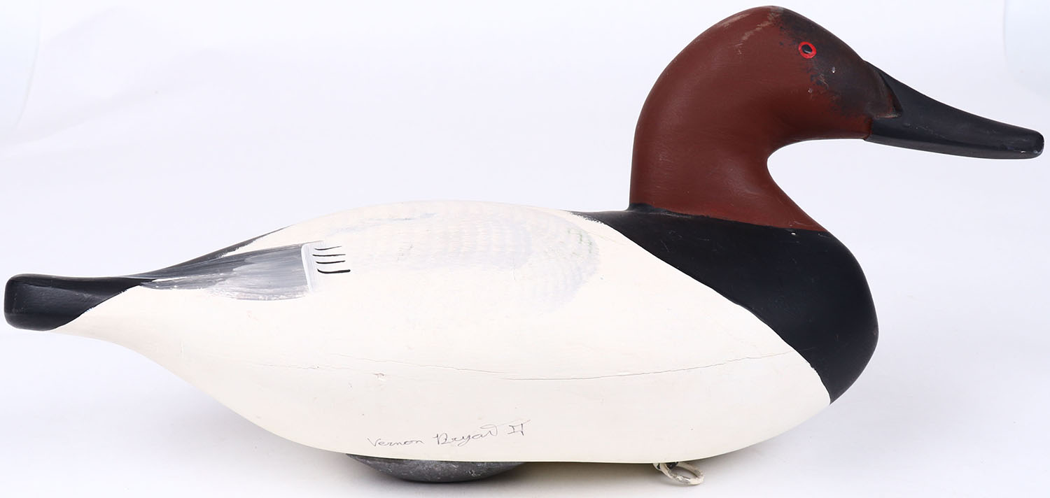 Canvasback Drake by Capt Vernon Bryant, Perriville MD, painted eyes, solid wood, structurally excellent, original paint, branded BRYANT and signed on bottom. Grade: MINT - Value: 50 to 100