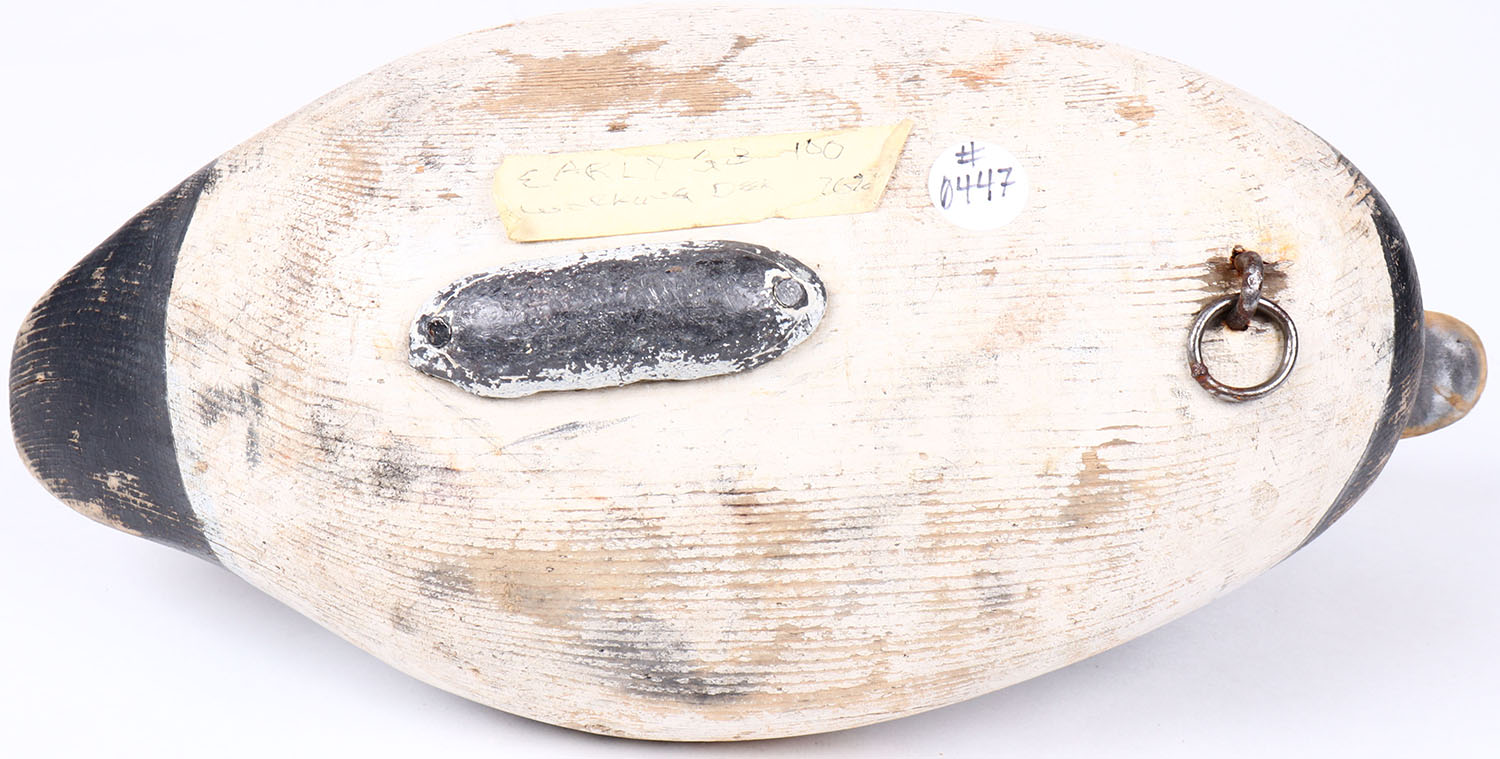 Bluebill Drake by unknown maker, MD, painted eyes, solid wood, has hairline age crack around neck, original paint with typical wear. Grade: Very Good ++ - Value: 30 to 60