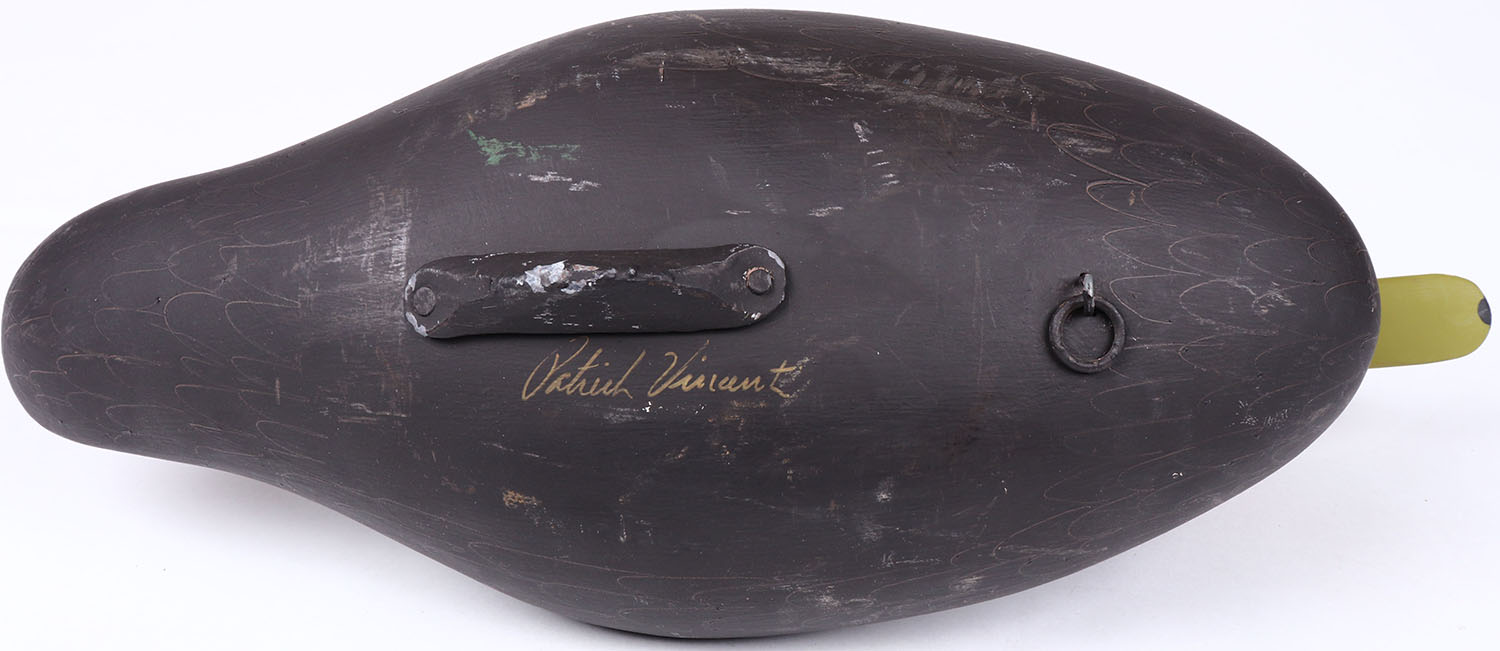 Black Duck by Patrick ''Pat'' Vincenti, Churchville, MD, painted eyes, solid wood, original paint with comb painting, signed on bottom, structurally excellent. Grade: MINT - Value: 30 to 60
