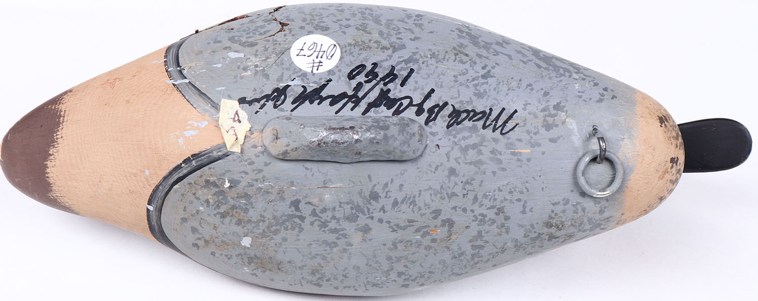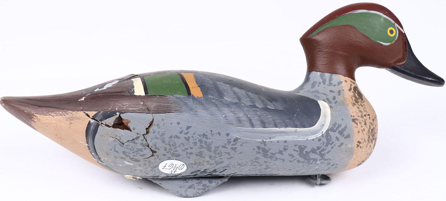 Green Wing Teal Drake by Capt. Harry Jobes Havre de Grace, MD, painted eyes, solid wood, original paint, has crack on bottom back, signed on bottom. Grade: Very Good ++ - Value: 40 to 80