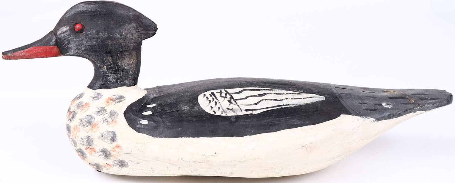 Red Breasted Merganser by Jerry B ??, tack eyes, solid wood, original paint, structurally excellent, signed on bottom. Grade: Excellent - Value: 30 to 60