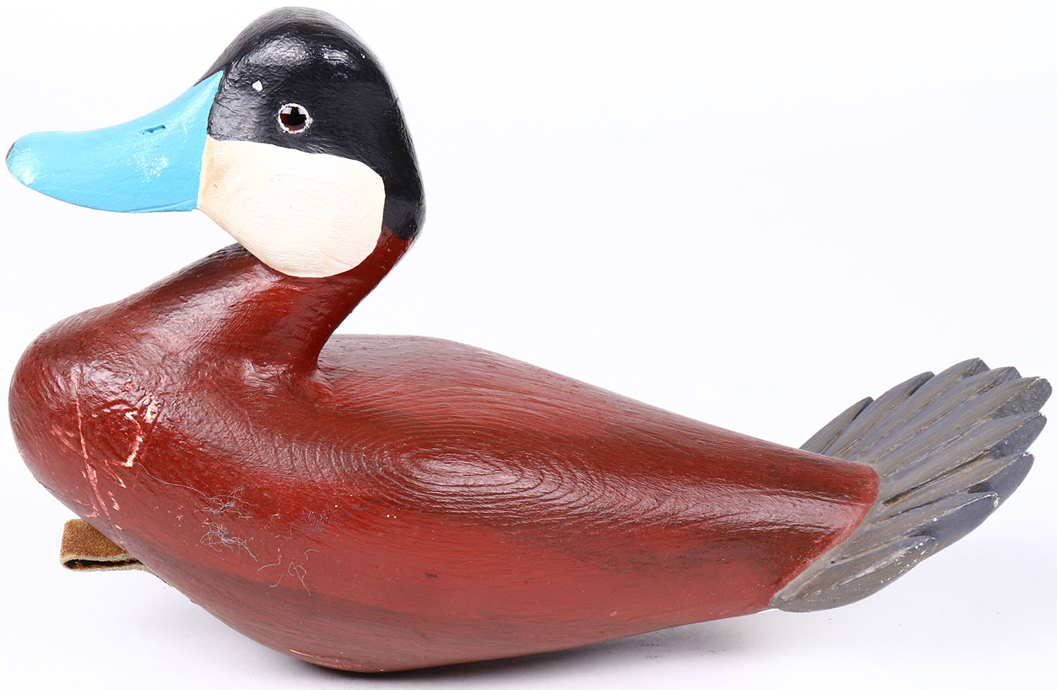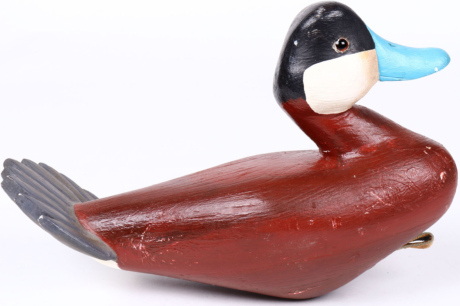 Ruddy Duck by unknown maker, glass eyes, solid wood, original paint, structurally excellent. Grade: Excellent - Value: 26 to 50