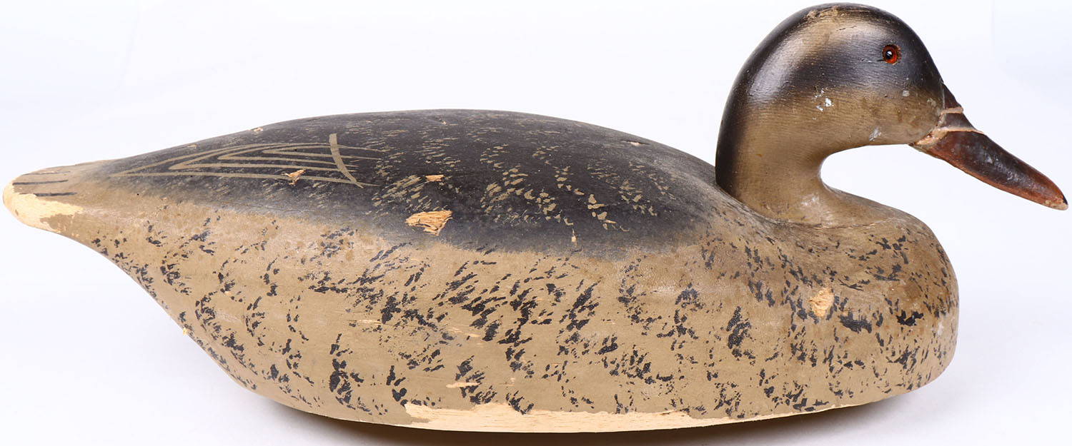 Mallard Hen by Herters, glass eyes, hollow wood, original paint, bill has been repaired. Grade: Very Good + - Value: 40 to 80