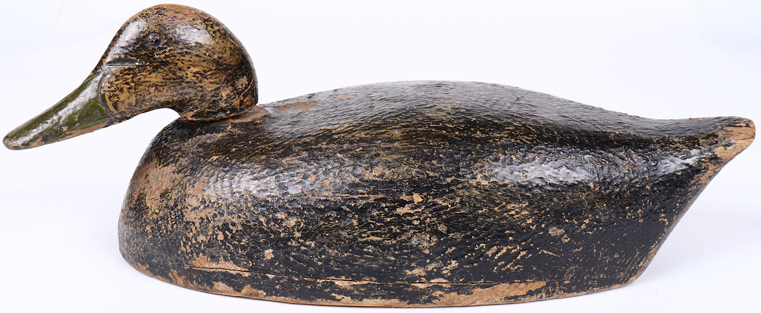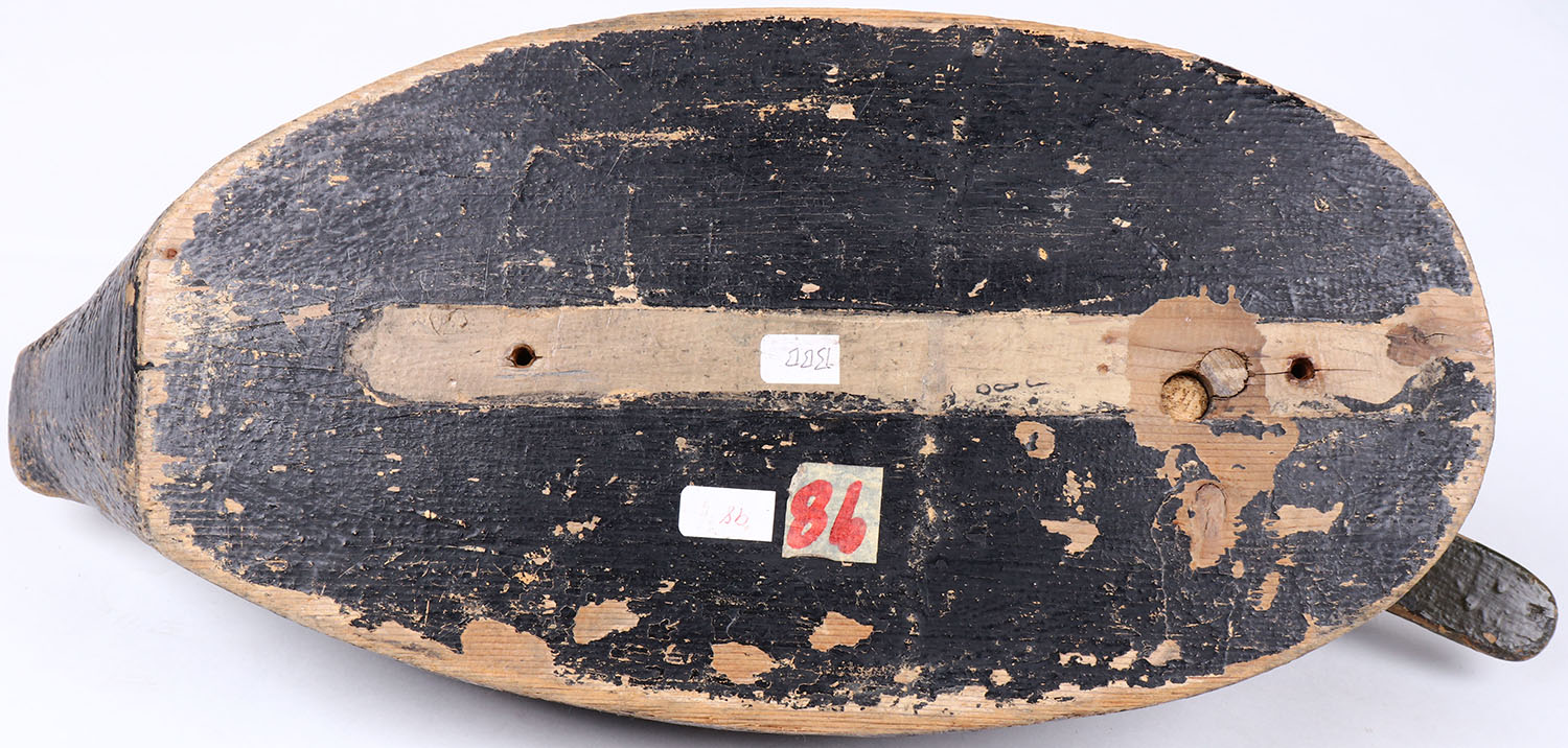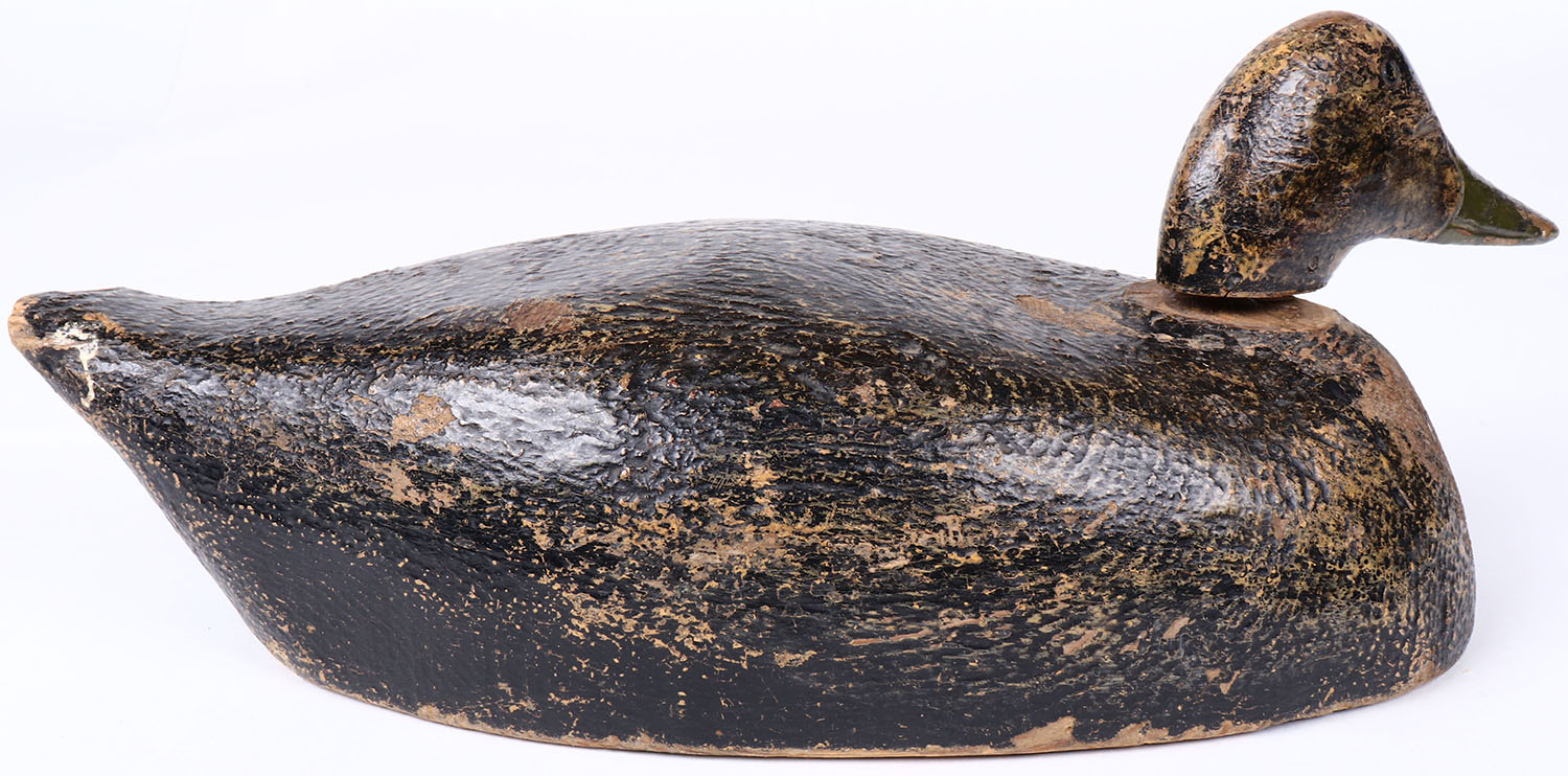 Black Duck by unknown maker, tack eyes, solid wood, original paint with typical wear, head comes completely off. Grade: Excellent - Value: 40 to 80