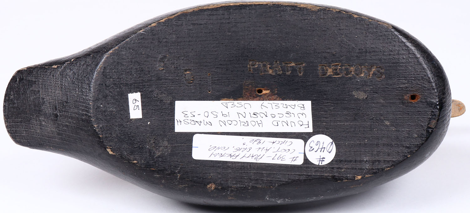Coot by Pratt Decoys, glass eyes, solid wood, structurally excellent, original paint with typical wear, signed on bottom. Grade: Excellent - Value: 50 to 100