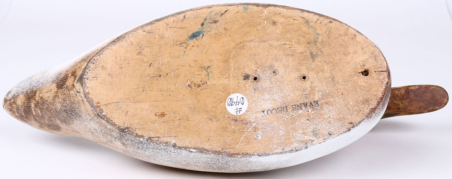 Mallard by Evans Decoy Co., WI, glass eyes, solid wood, original paint, structurally excellent, stamped on bottom. Grade: Excellent - Value: 20 to 50