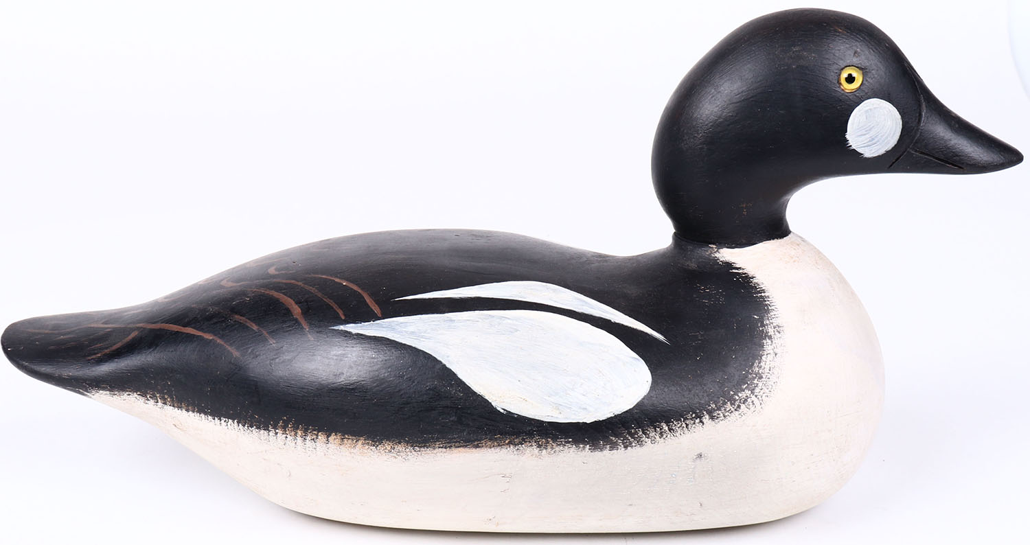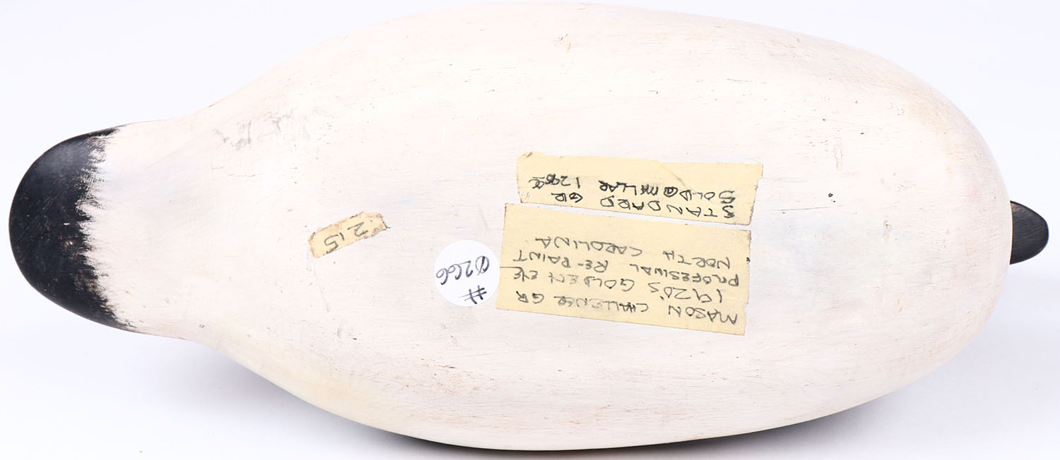 Goldeneye Drake by Mason Decoy Company, Detroit, MI,1896-1924 standard grade, glass eyes, solid wood, repainted, signed on bottom, structurally excellent. Grade: MINT - Value: 50 to 100