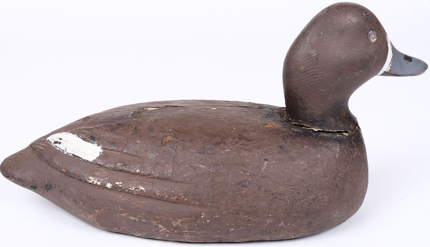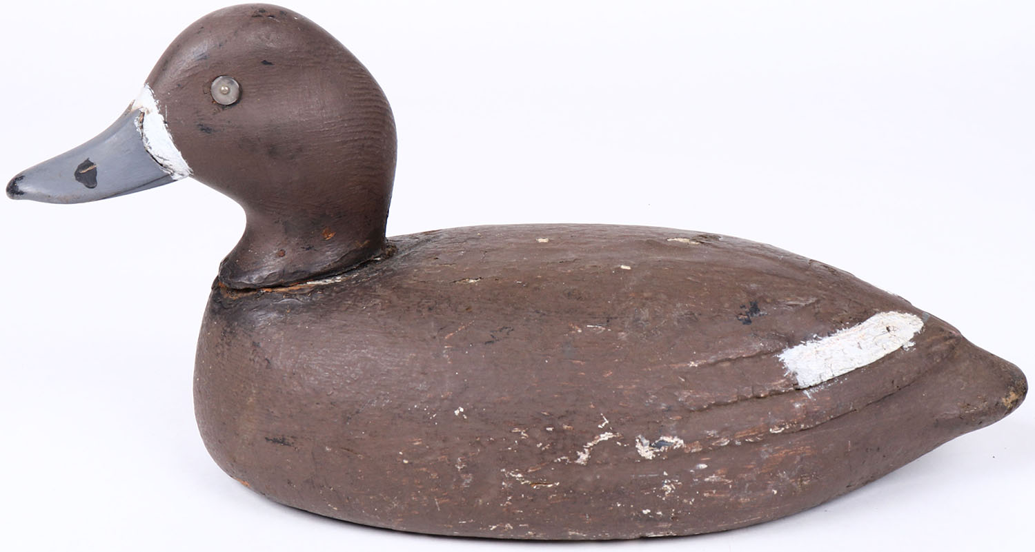 Bluebill Hen by unknown maker, glass eyes, solid wood, original paint, head is loose. Grade: Excellent - Value: 20 to 40