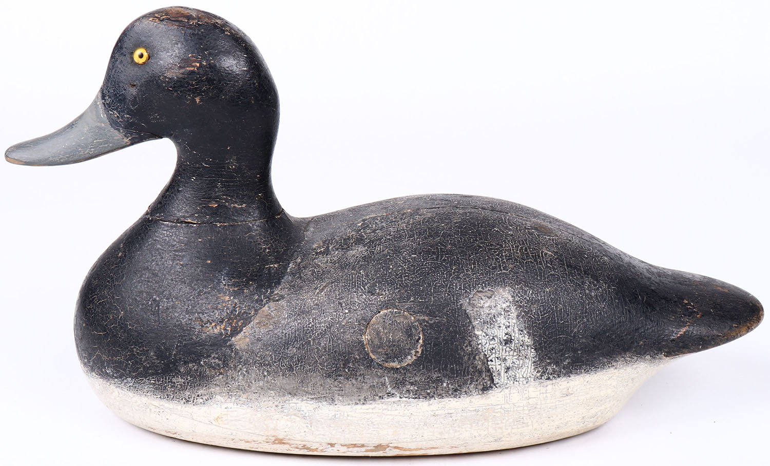 Bluebill Drake by Gus Nelow, Omro, Wisc, O.P. glass eyes, solid wood, original paint, branded JB on bottom, has hairline age crack on back. Grade: Excellent - Value: 100 to 200