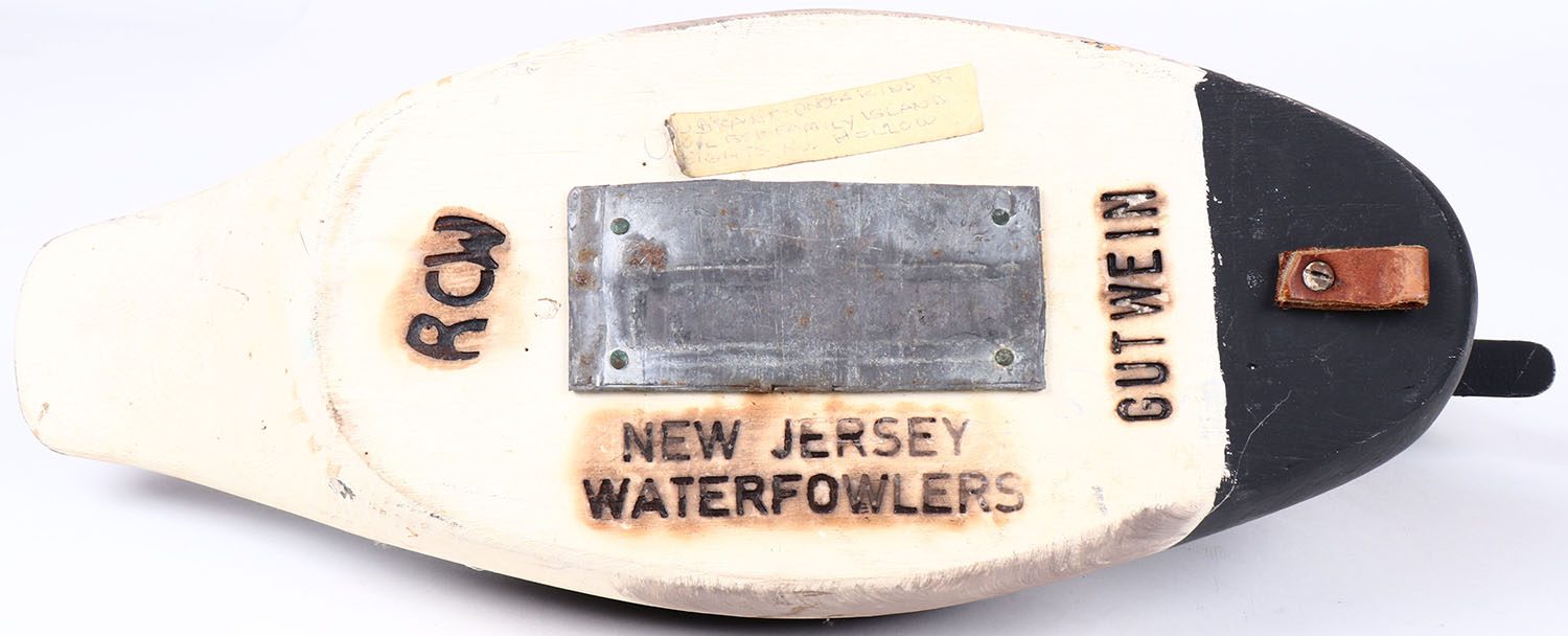 Atlantic Brant by unknown, glass eyes, hollow wood, original paint, structurally excellent, branded on bottom by NEW JERSEY WILDFOWLERS. Grade: MINT - Value: 40 to 80