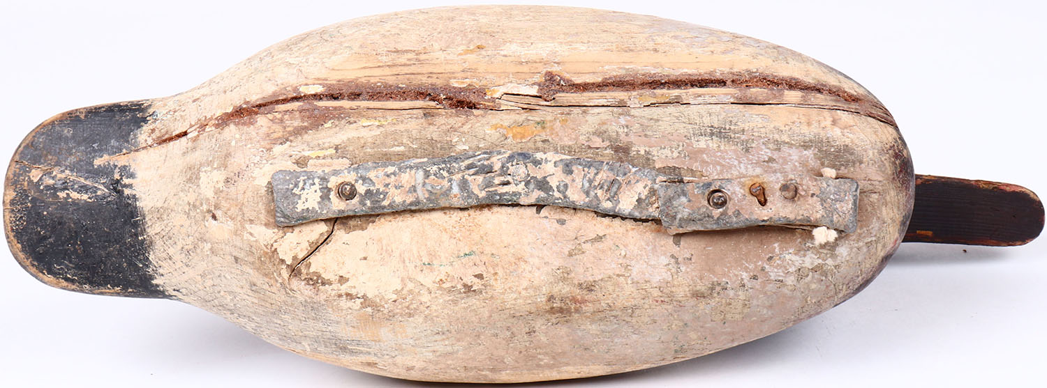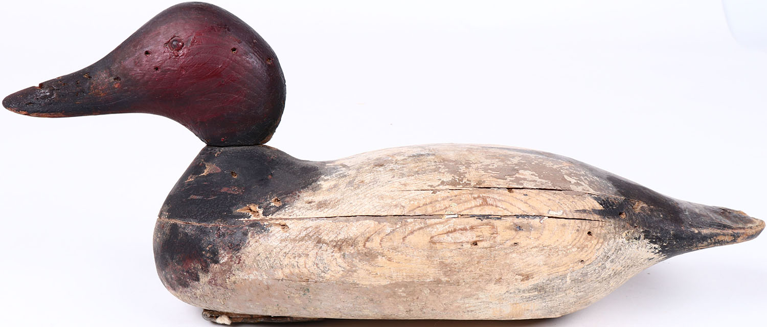 Canvasback Drake by unknown factory, glass eyes, one eye is missing, original paint, has age cracks on back and on bottom. Grade: Very Good ++ - Value: 30 to 60