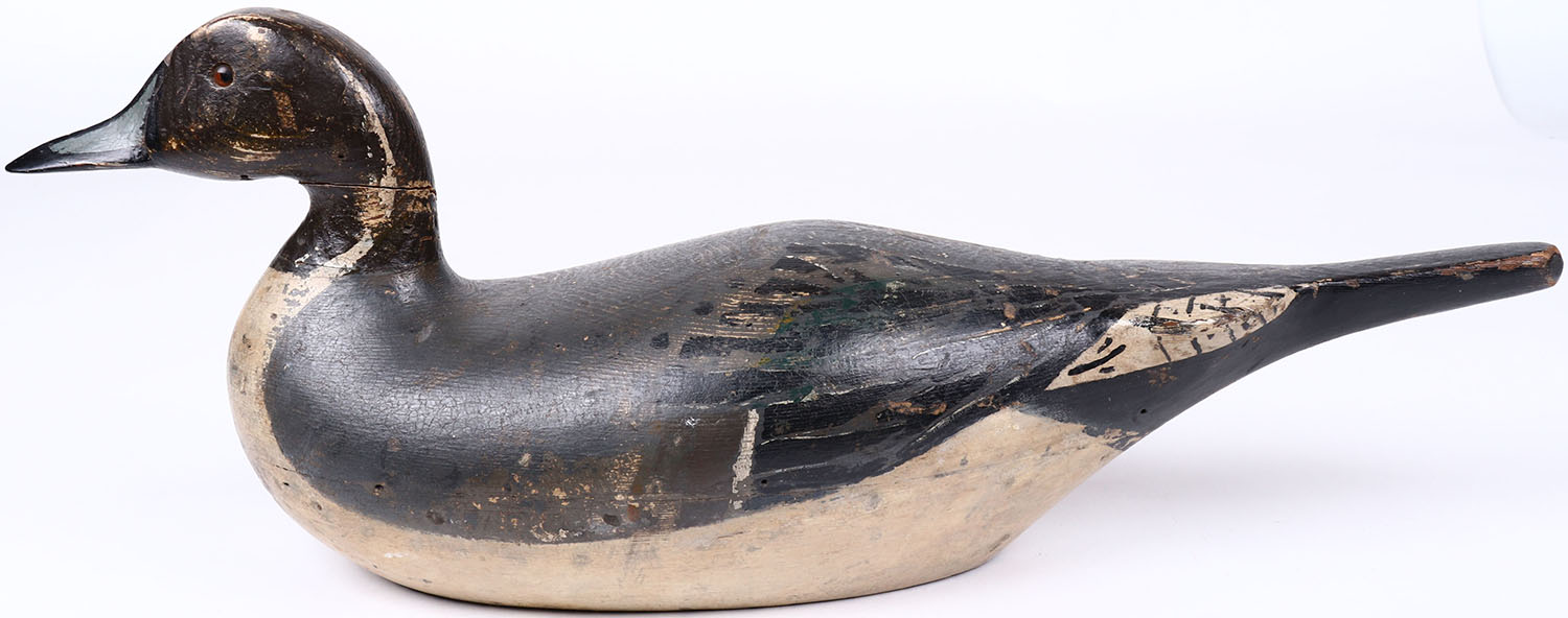Pintail Drake by Charles Bergman, Astoria, OR, glass eyes, hollow wood, original Emil Hendrickson re-paint, neck is broken and comes completely off. Grade: Very Good ++ - Value: 500 to 1500