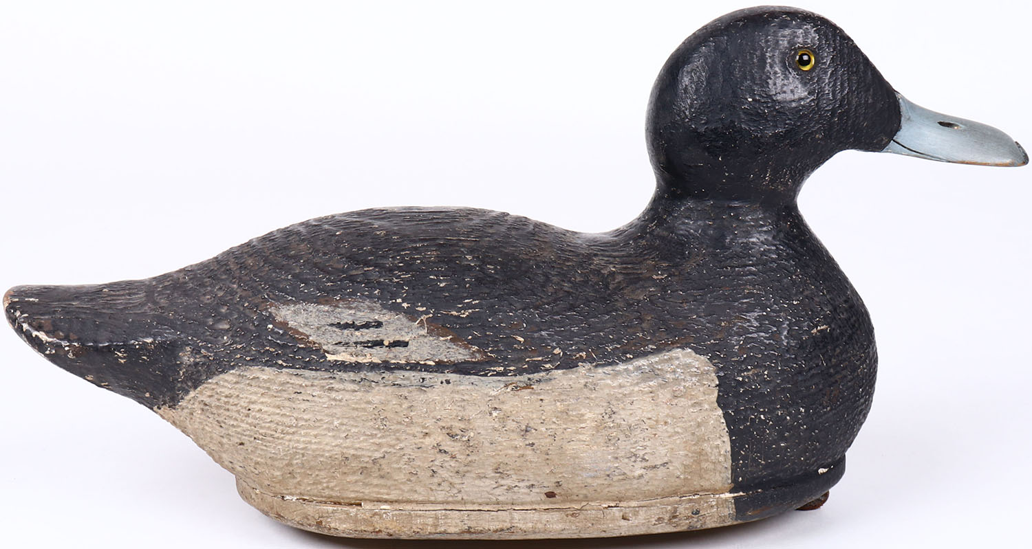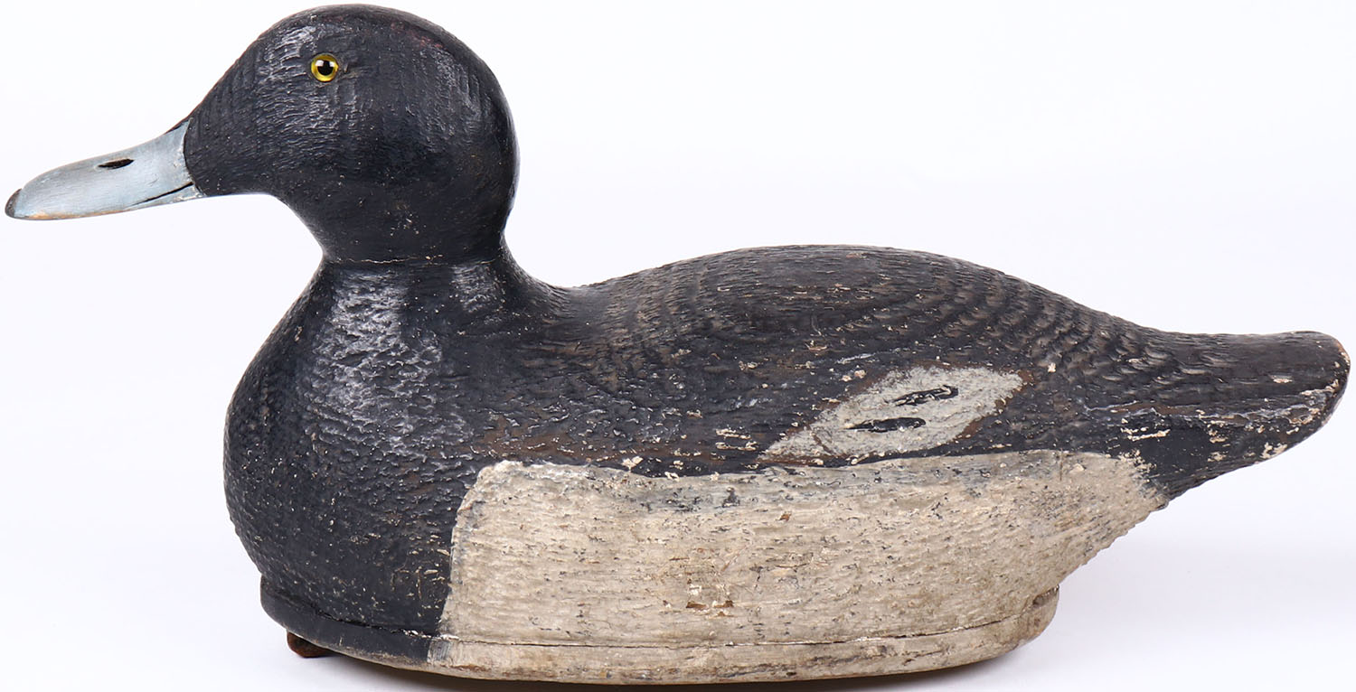 Bluebill Drake by unknown maker, glass eyes, hollow wood, original paint, structurally excellent. Grade: Excellent + - Value: 20 to 60