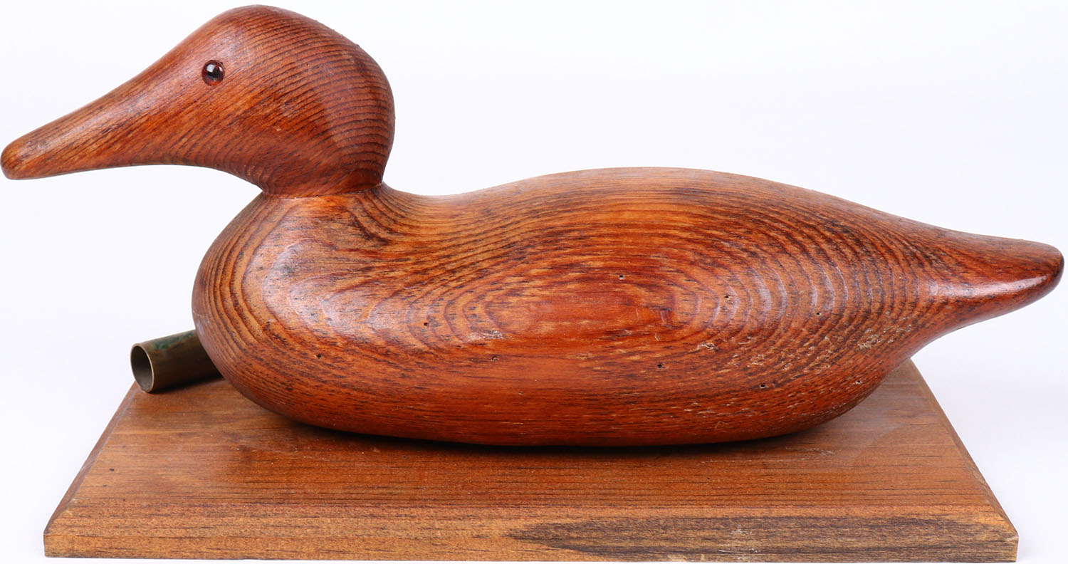 Mallard Hen by Mason Decoy Company (1980s repop), sometimes paired with a Mason Decoy Company commemorative Wooden Box, glass eyes, solid wood on wood base with empty brass shotshell on it, structurally excellent. Grade: MINT - Value: 10 to 30