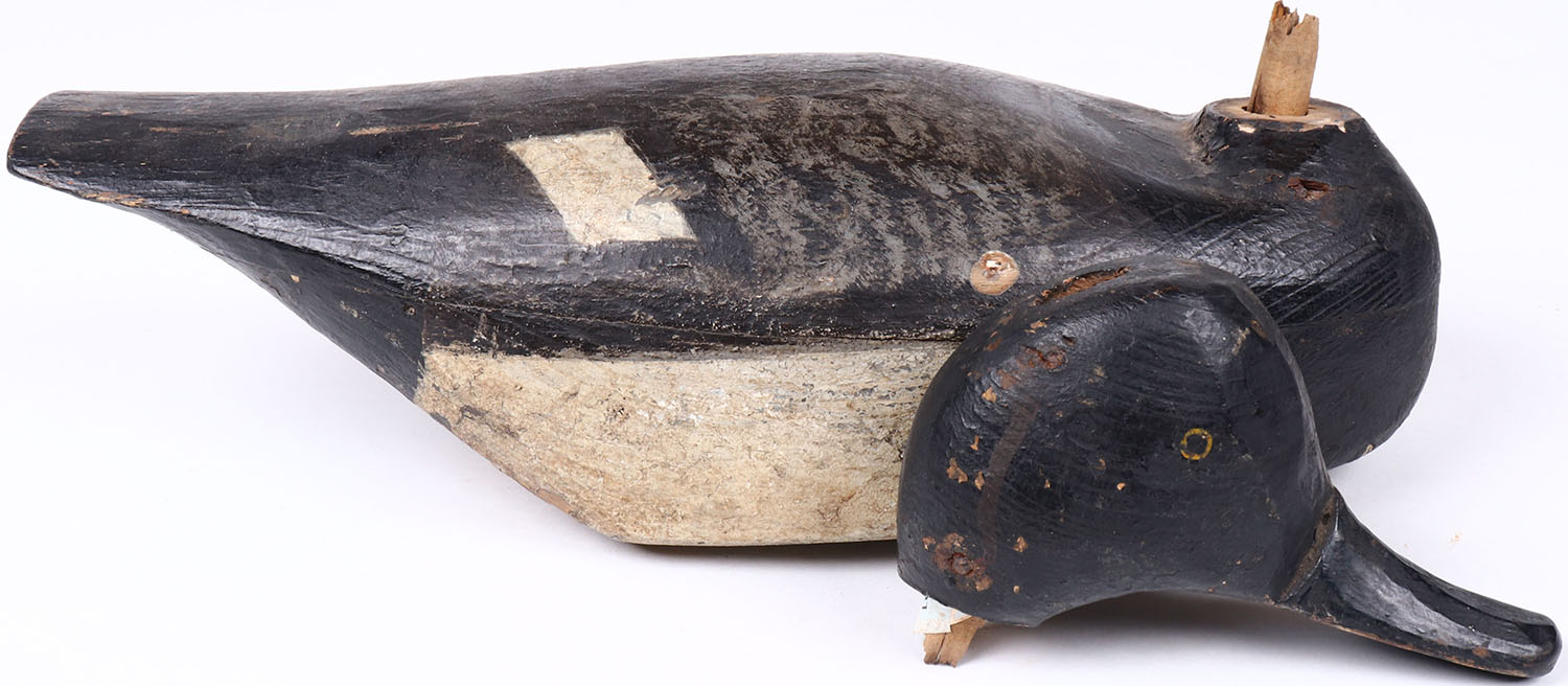 Bluebill Drake by unknown maker, NJ?, painted eyes, hollow wood, head is broken off from body, original paint. Grade: Very Good + - Value: 50 to 100