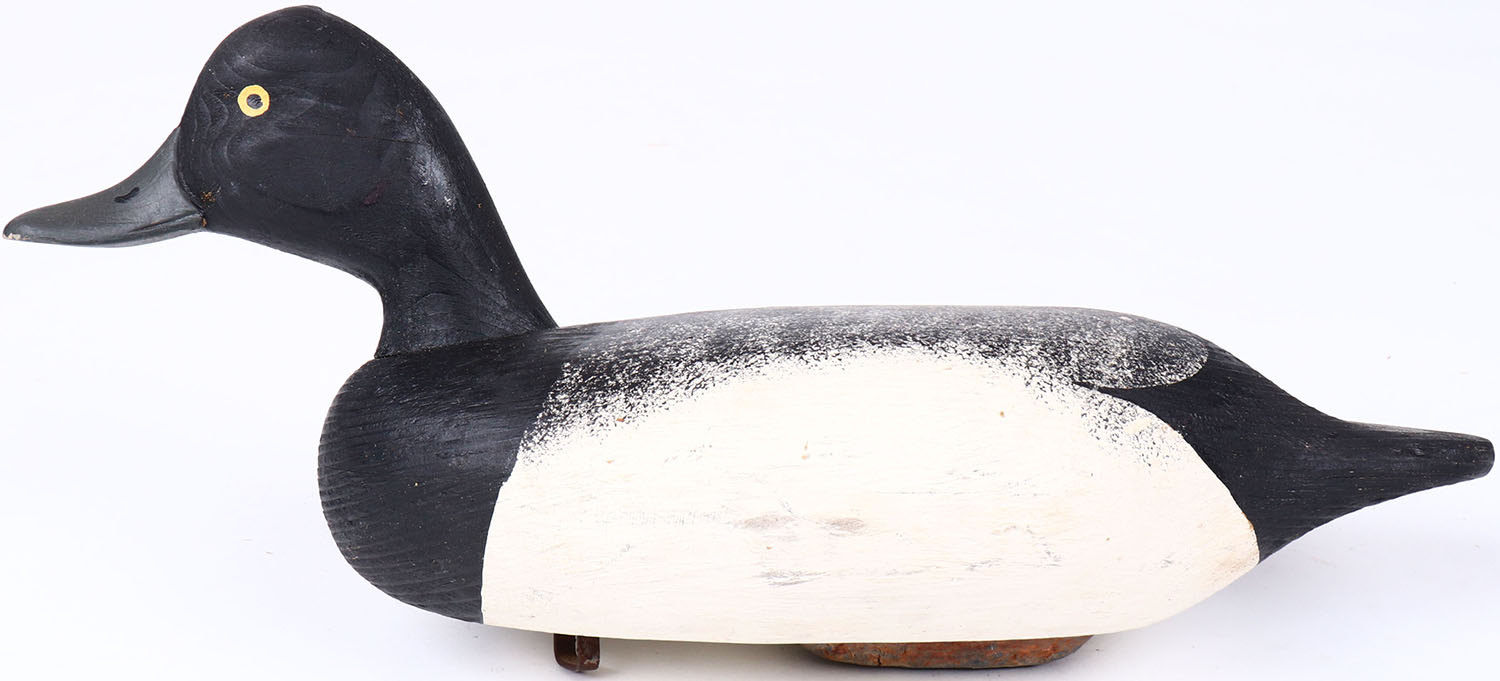 Bluebill Drake by JTB, painted eyes, solid wood, original paint, structurally excellent, branded JTB on bottom. Grade: MINT - Value: 30 to 60
