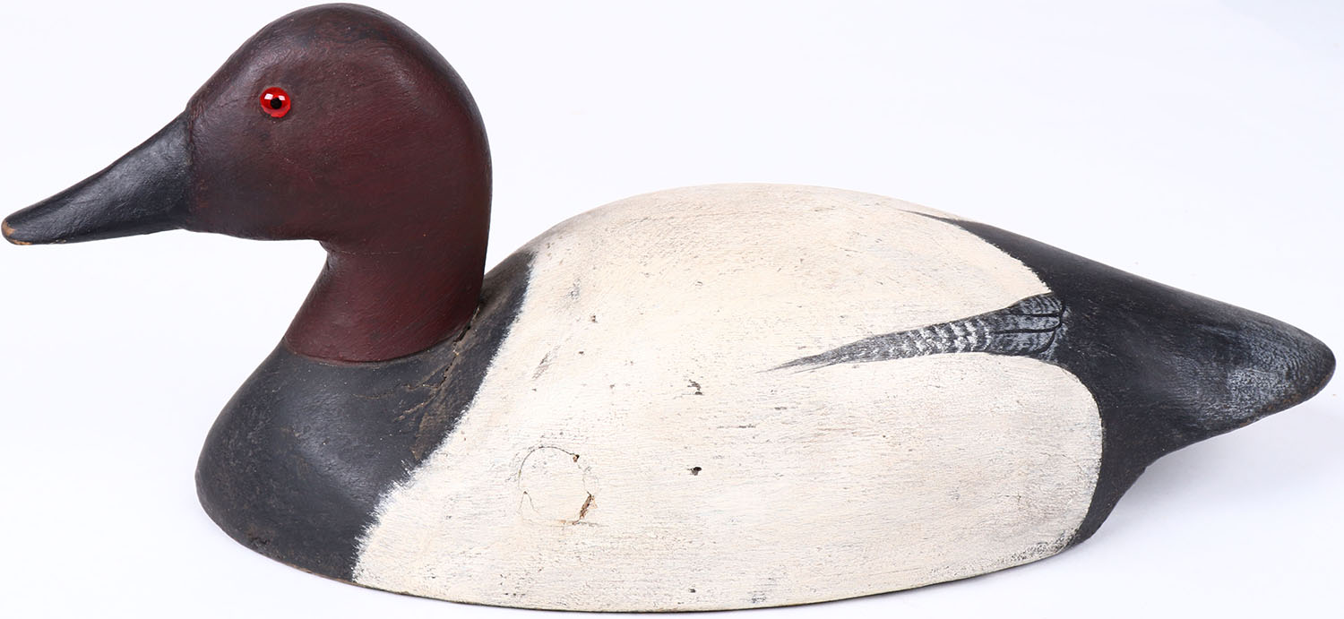 Canvasback Drake by unknown maker, glass eyes, solid wood, original paint, structurally excellent. Grade: Excellent - Value: 40 to 80