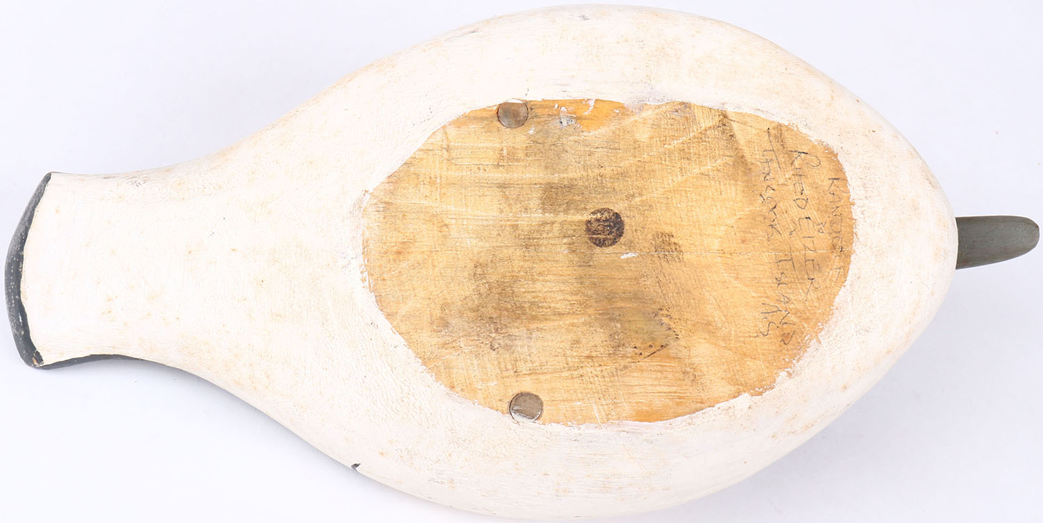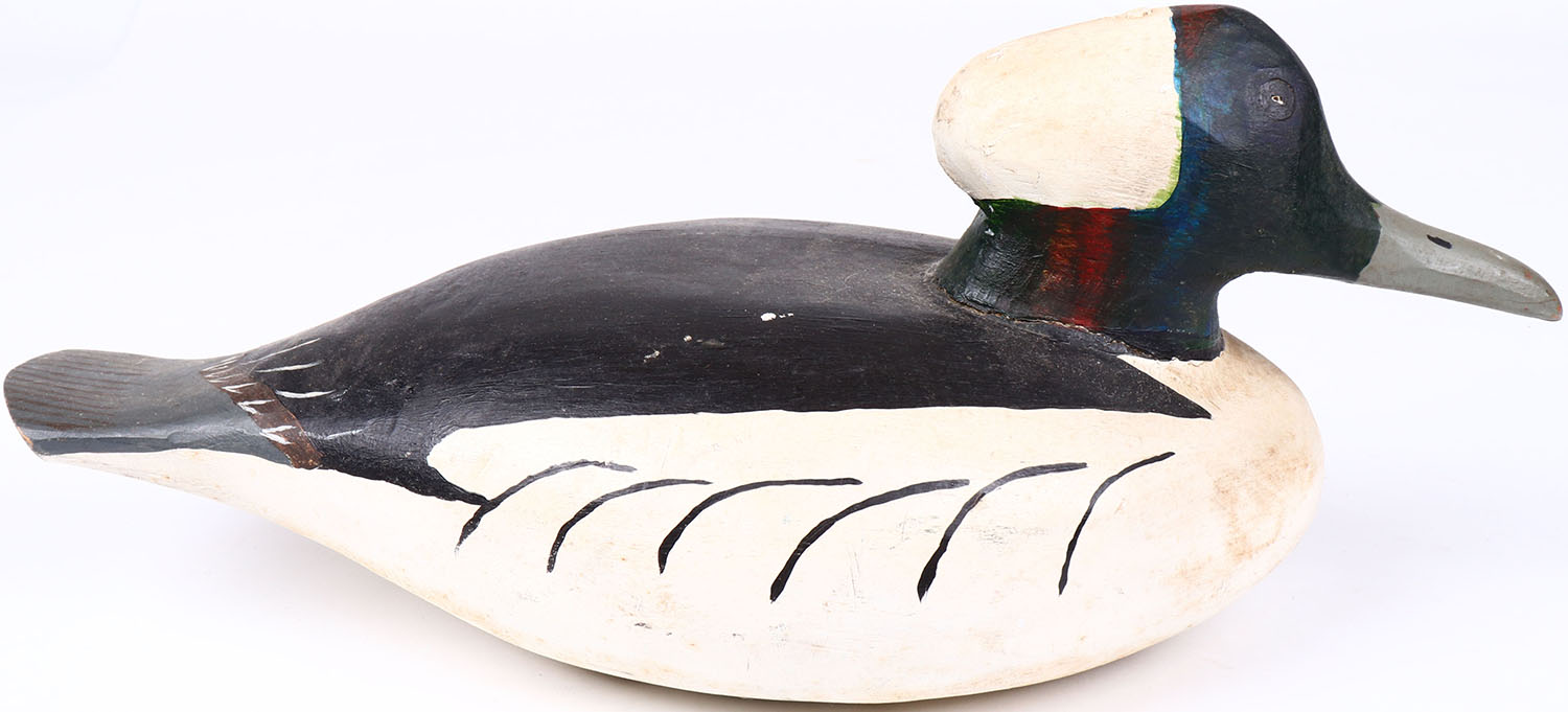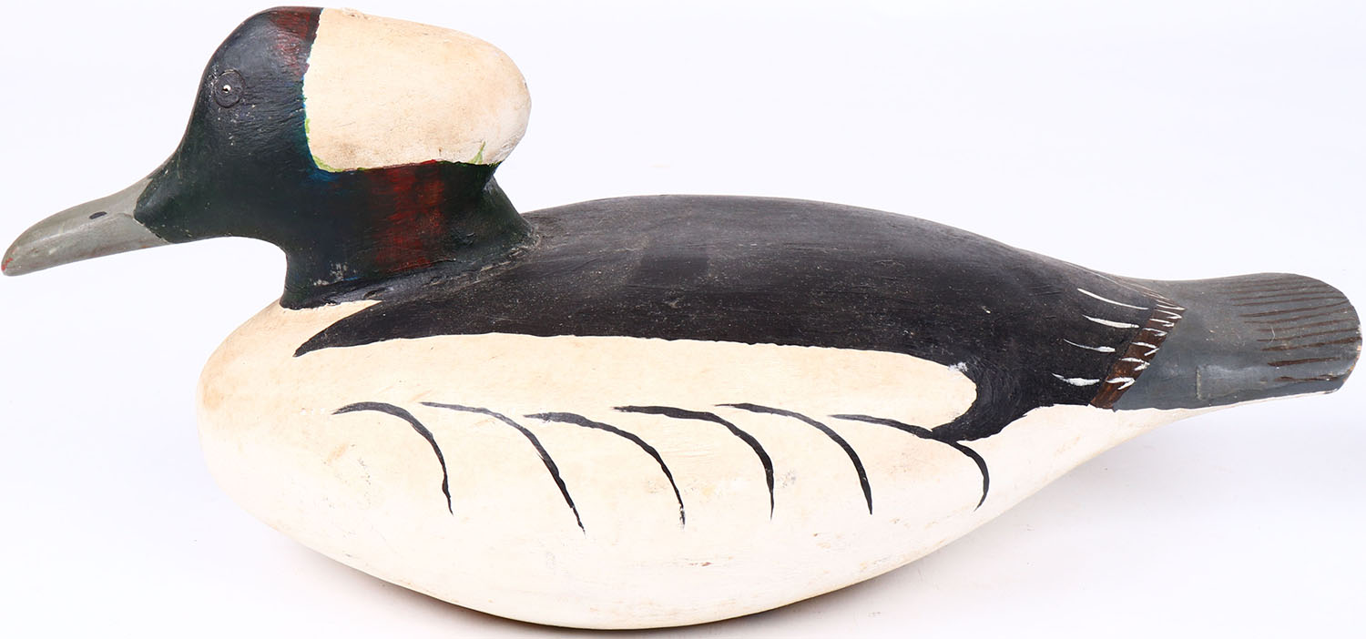 Hooded Merganser by Randolf N Ritedeizer, Tancook Island, NS. Painted eyes, solid wood, original paint, structurally excellent, signed on bottom. Grade: Excellent + - Value: 20 to 40