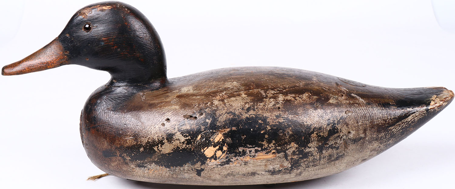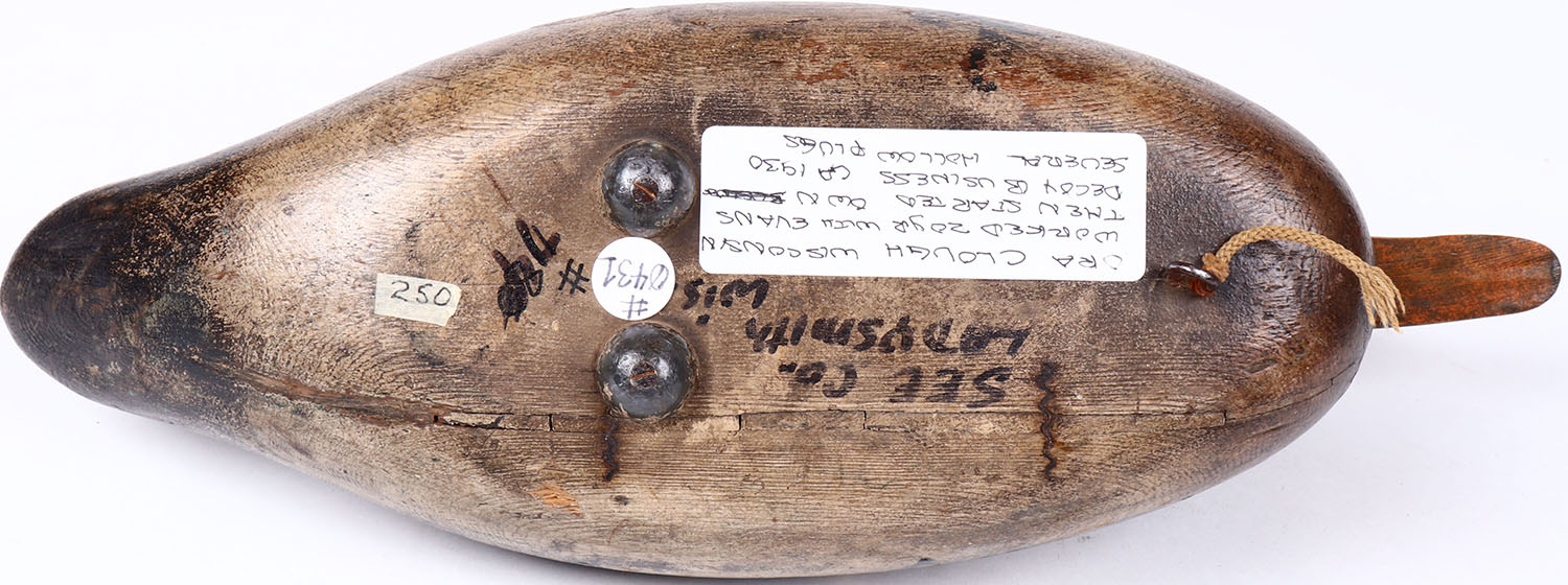 Mallard Drake by ? Ora Clough, WI, glass eyes, hollow wood, original paint with typical wear, structurally excellent, signed on bottom. Grade: Excellent - Value: 100 to 200