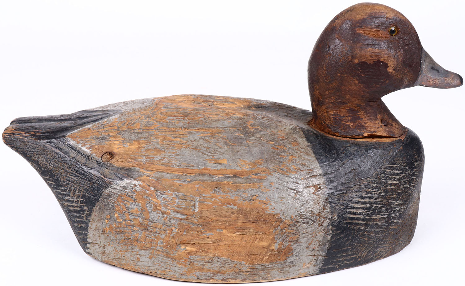Redhead Drake by Frank Schmidt, MI, Glass eyes, solid wood, original paint, structurally excellent, signed on bottom. Grade: Excellent + - Value: 50 to 100
