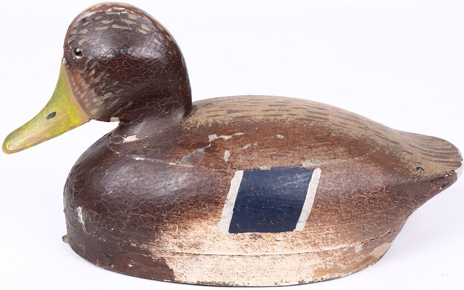 Mallard Hen by C.R. Lemke, Milwaukee, Omro, glass eyes, hollow wood, original paint, structurally excellent, signed on bottom. Grade: Excellent + - Value: 50 to 100