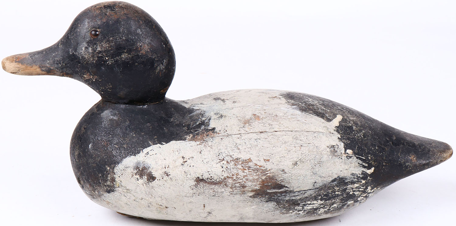 Bluebill Drake by Mason Decoy Company, glass eyes, solid wood, original paint with typical wear, has age cracks on back. Grade: Excellent - Value: 40 to 80