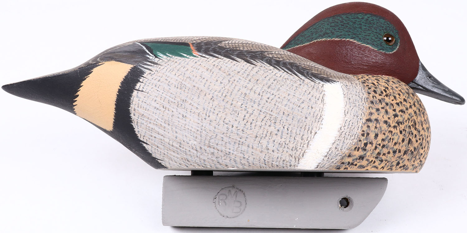 Green Wing Teal Drake by Bodnar, glass eyes, solid wood, orignal paint with beautiful feather detail, structurally excellent, branded BODNAR and RMB on bottom. Grade: MINT - Value: 50 to 100