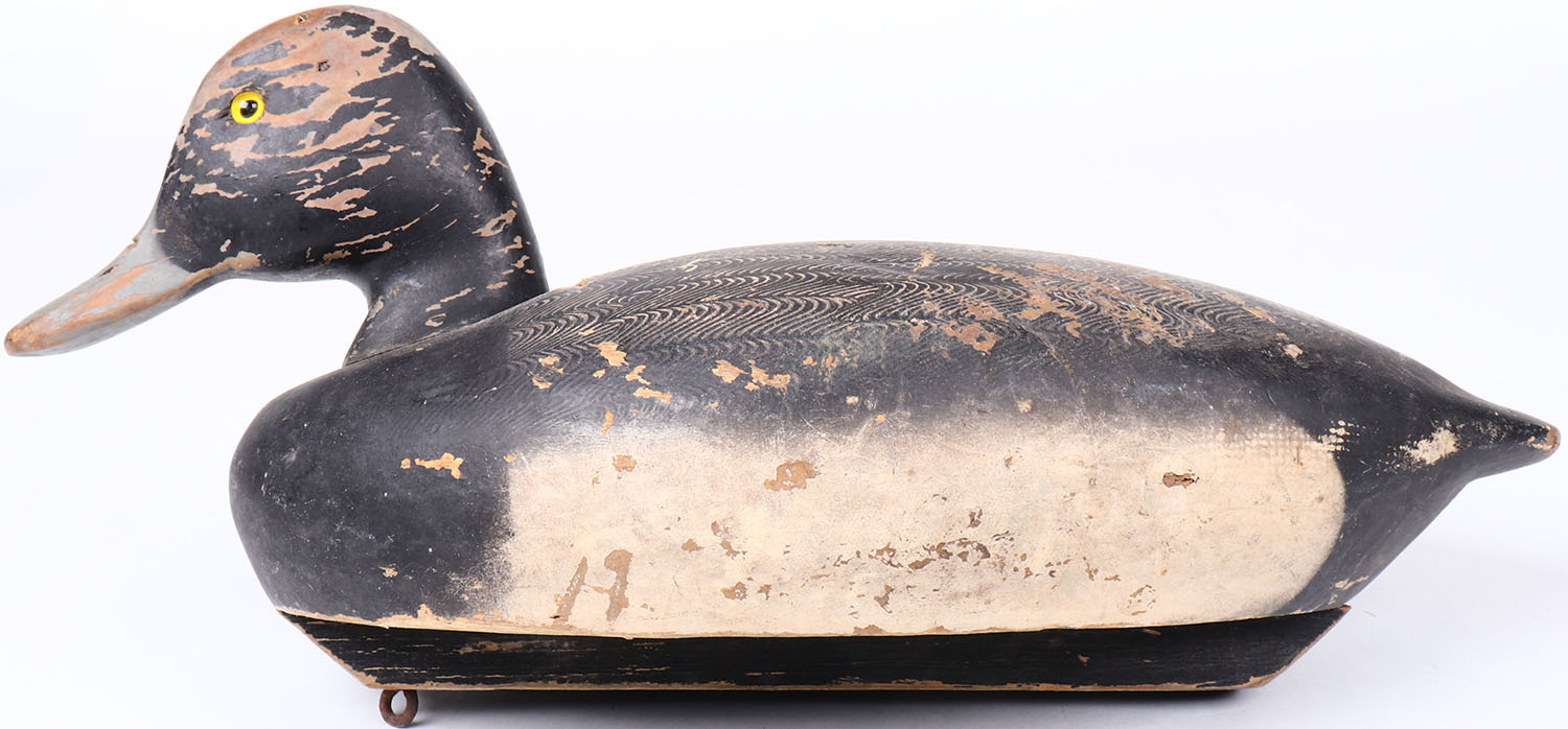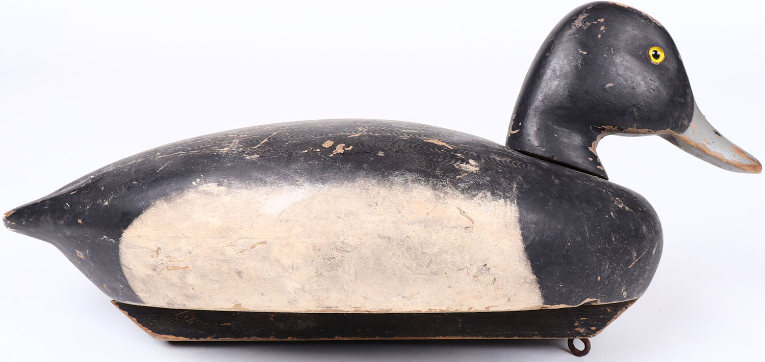 Bluebill Drake by Decoys Unlimited R.D.H. Wattsburg Road, Erie, PA, glass eyes, hollow wood, original paint with comb painting, head is missing some paint. Grade: Excellent - Value: 20 to 40